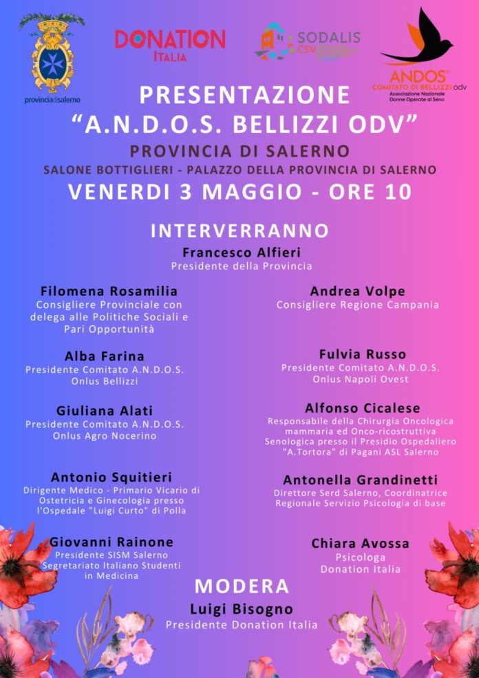 In occasione dei dieci anni dalla nascita del Comitato A.N.D.O.S. (Associazione Nazionale Donne Operate al Seno) di Bellizzi, in collaborazione con DONATION Italia, la Provincia di Salerno e il CSV Sodalis Salerno, l’A.N.D.O.S. ha organizzato un convegno di presentazione delle tante attività svolte in questi primi ed importanti dieci anni di vita associativa.