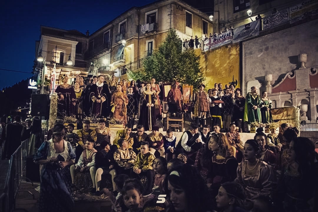 Corteo storico col oltre 200 figuranti (corteo dei popolani e corteo dei nobili); inoltre, grazie alla partecipazione di gruppi storici provenienti da tutta Italia e dei tantissimi ragazzi del posto che da anni partecipano alla rassegna, durante i tre giorni di manifestazione si terranno numerosi spettacoli, verranno allestiti mercati rinascimentali ed orientali, accampamenti militari, taverne (DAMA DI BACCO: un vero e proprio “pub rinascimentale”, gioco della dama con le pedine rappresentate da bicchierini di vino locale; AMPOLLA D’ORIENTE: location orientale con arrosticini di pecora e fuoco orientale ossia zolletta di zucchero con alcool aromatizzato, danza del ventre; VIZI DI CIACCO: un punto di ristoro rinascimentale, gestito da dolci donzelle con degustazione di liquori rinascimentali e dolci squisiti); inoltre, pane e uoglio, pasta, grigliata del pellegrino, zuppa di fagioli e salsiccia e ruospi (frittelle con le alici e uva passa); centinaia di figuranti saranno impegnati lungo il percorso come giostrai de la terra de la sala (giostre rinascimentali fedelmente riprodotte: tra cui giostra del maialino e giostra delle papere), e come figuranti antichi mestieri, e poi ancora, falconieri, archibugieri, musici, artisti di strada, giullari, , torneo dei quattro cavalieri de la terra de la Sala e giostra degli anelli.