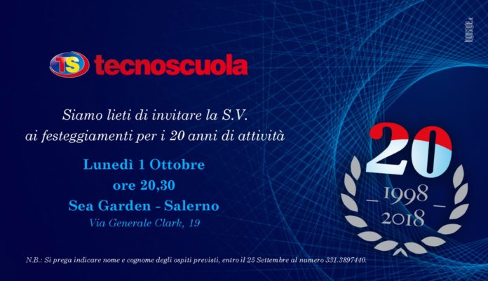 Il Centro Formativo Tecnoscuola, da sempre impegnato nel sociale, compie 20 anni d’attività e festeggia l’anniversario lunedì 1 ottobre al Sea Garden di Salerno.