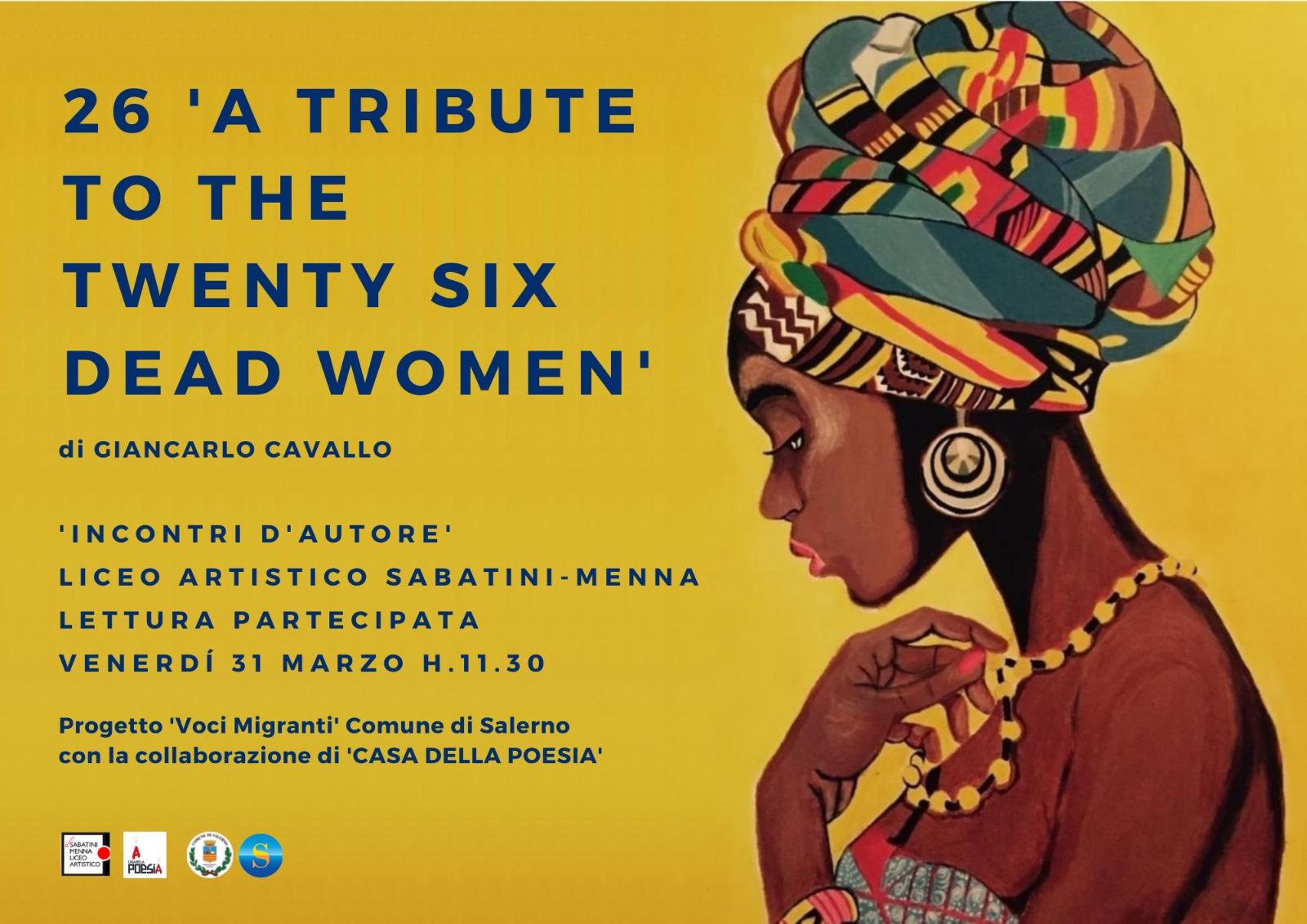 “26 – Tribute to the twenty-six dead women”, il poemetto dedicato alle 26 donne morte nel Mediterraneo e sbarcate a Salerno il 6 novembre 2017, nella sua formula di “lettura partecipata”, con “Casa della Poesia” di Baronissi e l’autore Giancarlo Cavallo, approda, venerdì 31 Marzo, nelle aule del “Liceo Artistico Sabatini-Menna” di Salerno in un incontro fortemente voluto dalla Dirigente Scolastica del Liceo, la dottoressa Renata Florimonte, dedicato alla poesia e alla riflessione, nell’ambito del progetto “Voci Migranti”.  Le allieve e gli allievi dell’Istituto si cimenteranno in una lettura condivisa con la collaborazione di ‘Casa della Poesia”, diretta dalla dottoressa Raffaella Marzano e dal   dottor Sergio Iagulli,    e dell’ autore del libro Giancarlo Cavallo che ha voluto dare voce alle ventisei donne nigeriane tra i 14 e i 20  anni, alcune delle quali incinte, naufragate su un  gommone il 3 novembre del 2017  a largo delle coste libiche; e recuperate, insieme  a circa 400 migranti,   sulla nave militare spagnola   Cantabria.  Queste donne sono state sepolte nel cimitero di Salerno: su ogni bara c’era una rosa bianca e una rosa azzurra, sui feretri delle ragazze incinte.