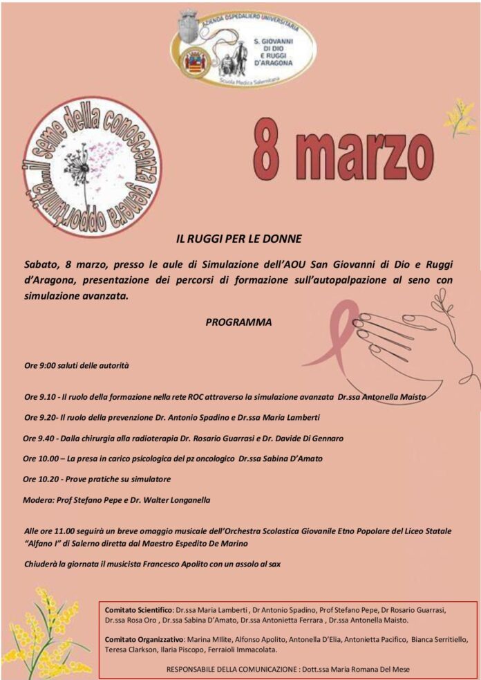 Sabato 8 marzo 2025, dalle ore 9.00 alle ore 11.00, in occasione della ‘Festa della Donna’, presso le Aule Multimediale di Simulazione Avanzata dell’AOU San Giovanni di Dio e Ruggi d’Aragona di Salerno, si terrà la presentazione dei ‘Percorsi di Formazione sull’Autopalpazione al Seno con l’ausilio di uno specifico Simulatore’.