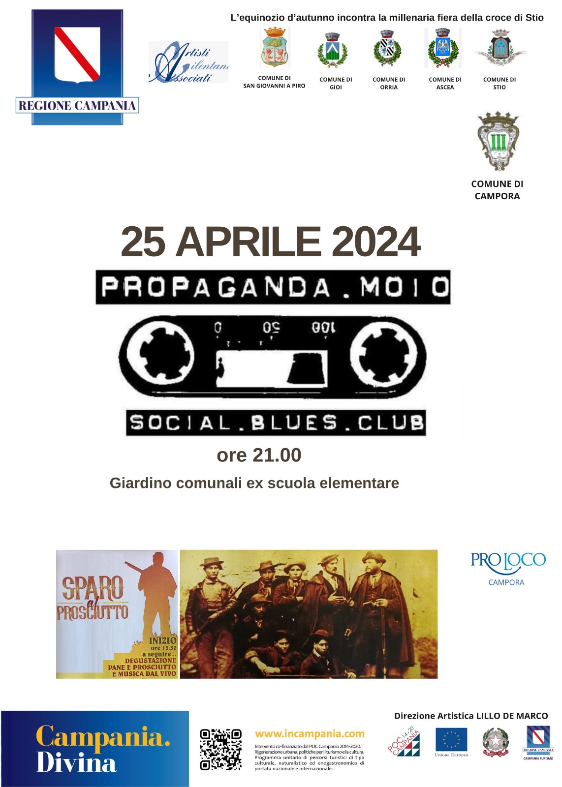 “Raccontiamo le eccellenze del territorio, valorizzandone storia e cultura, attraverso la musica, gli eventi di tutela delle tipicità e gli itinerari”. Così, il sindaco del Comune di Campora, Antonio Morrone, annuncia il programma degli eventi di valorizzazione delle eccellenze territoriali e degli itinerari che si terranno nello splendido borgo medioevale di Campora che il 25 aprile alle ore 21 presso gli ex giardini comunali ospiterà il gruppo musicale “Propaganda Moio social blues club”. il gruppo di artisti cilentani che, attraverso la musica, promuovono l’esaltazione per corde, microfoni e tamburi delle canzoni suonate in chiave blues.