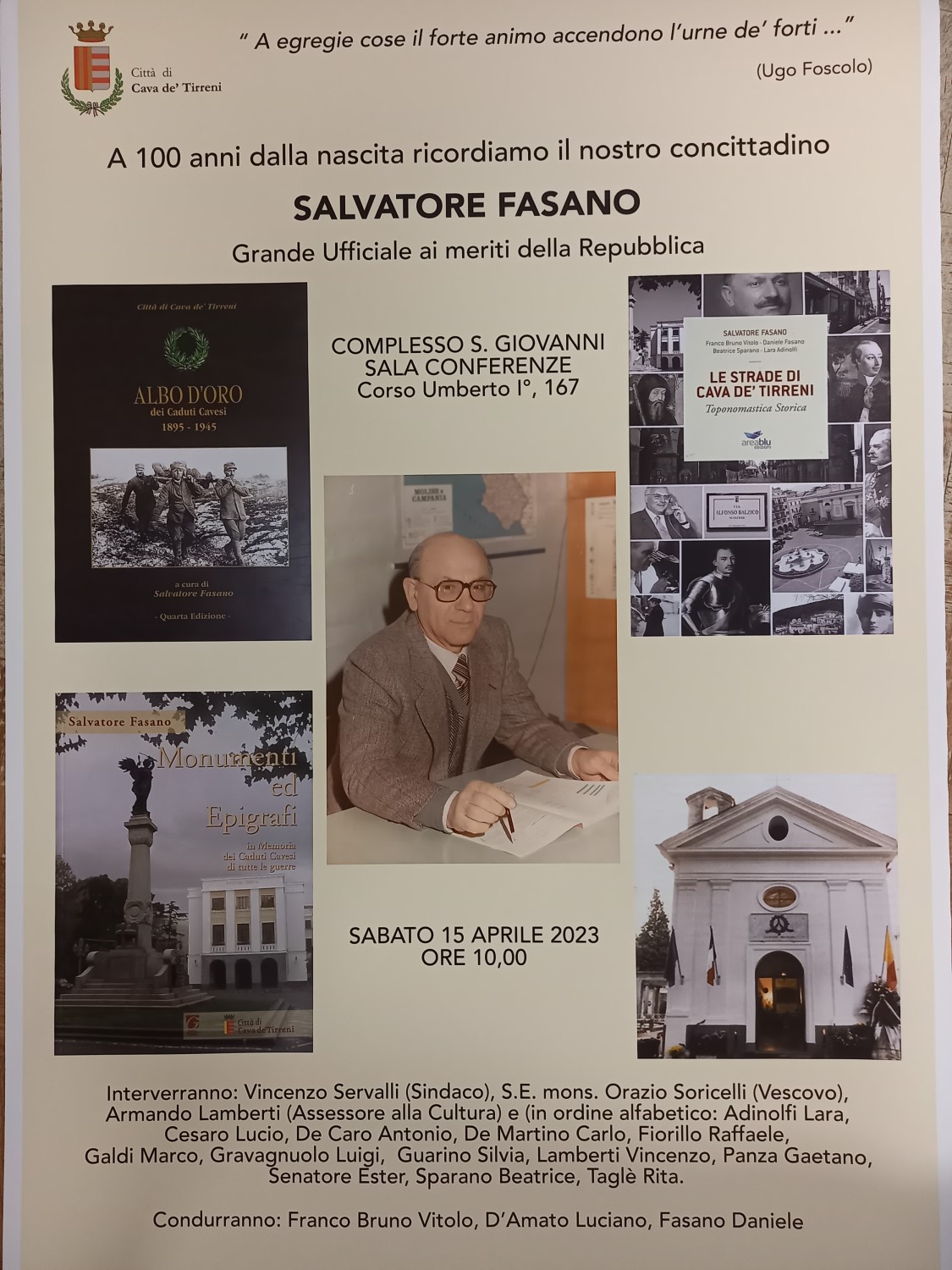Condurranno Franco Bruno Vitolo, Luciano D’Amato e Daniele Fasano.Salvatore Fasano è nato a Cava de’ Tirreni il 17 aprile 1923 da Antonio ed Assunta D’Amato. Docente in pensione, Salvatore Fasano è scomparso il 22 settembre 2020. A lui è intitolato il Sacrario Militare di Cava de’ Tirreni. È stato consigliere comunale ed assessore all’istruzione del Comune di Cava de’ Tirreni, autore del libro Albo d’Oro dei Caduti Cavesi 1895-1945, fondatore e Presidente del Comitato per il Sacrario Militare di Cava de’ Tirreni, ex Presidente della Commissione Toponomastica cittadina, Commendatore dell’Ordine al “Merito della Repubblica” e successivamente, di iniziativa del Presidente della Repubblica Carlo Azeglio Ciampi Grande Ufficiale al “Merito della Repubblica”. Ultimo di 14 figli, ha avuto quali suoi germani Vincenza coniugata con Gaetano Sabatino, Lucia (nubile), Matteo coniugato con Eugenia Grasso, Anna coniugata con Ernesto Mascolo, Maria deceduta dopo un anno, Mario coniugato con Anna Ciaglia, Vincenzo deceduto per parto prematuro, Enrico coniugato con Maria Russo, Carmela coniugata con Pietro Russo, Umberto coniugato con Alfonsina Farano, Maddalena coniugata con Luigi Barone, Livia deceduta a 2 anni, Ernesto coniugata con Ida Pisapia. A soli 12 anni subisce la perdita del padre. Le precarie condizioni economiche della famiglia lo costringono ad abbandonare la scuola. Successivamente, riesce ad iscriversi alla scuola di Avviamento Professionale, superando gli esami di ammissione alle superiori. Studia da autodidatta diplomandosi al magistrale. Gli anni del dopoguerra, però, lo obbligano a lasciare gli studi. Li riprenderà nel 1950 per affrontare e vincere in Avellino il primo concorso magistrale (il secondo lo vincerà nel 1958 in provincia di Salerno). Nel 1953 Salvatore sposa Delia Cristini da cui avrà Daniele, Lucio e Livia. Dal 1950 fino al 1985, anno del pensionamento, insegna nelle scuole elementari, ottenendo, come ricorda lo storico Monsignor Attilio Della Porta “il plauso dei suoi superiori che hanno ammirato in lui la preparazione didattica, il senso del dovere, la generosa dedizione alla causa scolastica” e dai colleghi delle scuole elementari di Passiano una targa di merito con medaglia d’oro.
