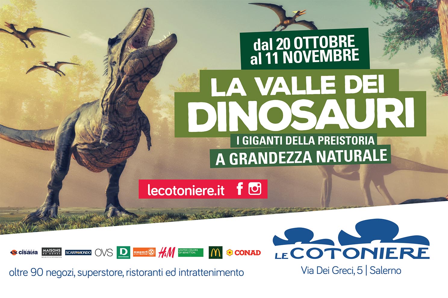 Da sabato 20 ottobre e fino a domenica 11 novembre il Centro Commerciale Le Cotoniere in Via dei Greci, 5 a Salerno, verrà catapultato nell’era più affascinante della preistoria con l’invasione di incredibili dinosauri a grandezza naturale. Il Centro, trasformato nella Valle dei Dinosauri, permetterà a grandi e piccini di immergersi in una delle ere più misteriose del pianeta Terra. Ci saranno anche un imponente T-Rex e un gigantesco Diplodoco di 9 metri tra gli esemplari esposti: un incontro con la Storia davvero emozionante, reso ancora più speciale dai laboratori di scavo nella Grotta Giurassica e dal “Baby Dino Special Day”.