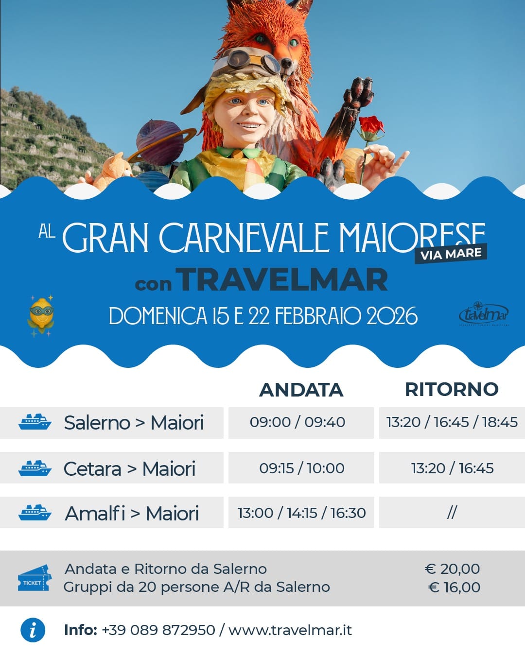 Per l’occasione sono previsti anche collegamenti marittimi garantiti dalle compagnie di navigazione. Travelmar ha previsto corse da Salerno verso Maiori alle 9 e alle 9.40 (partenze anche da Cetara alle 9.15 e alle 10 e da Amalfi alle 13, 14.15, e 16.30) mentre il ritorno alle 13.20, 16.45 (in questi orari i traghetti faranno sosta anche a Cetara) e alle 18.45. Grassi Junior invece garantirà collegamenti da Salerno verso Maiori alle 9.50 (il traghetto farà tappa anche a Cetara alle 10.15) e alle 14.35 mentre il ritorno alle 13.50 (con sosta a Cetara) e alle 18.35. Altri collegamenti da Amalfi alle 13.15 e da Positano alle 8.40 e alle 12.50. Il ritorno alle 13.50 e alle 18.30.
