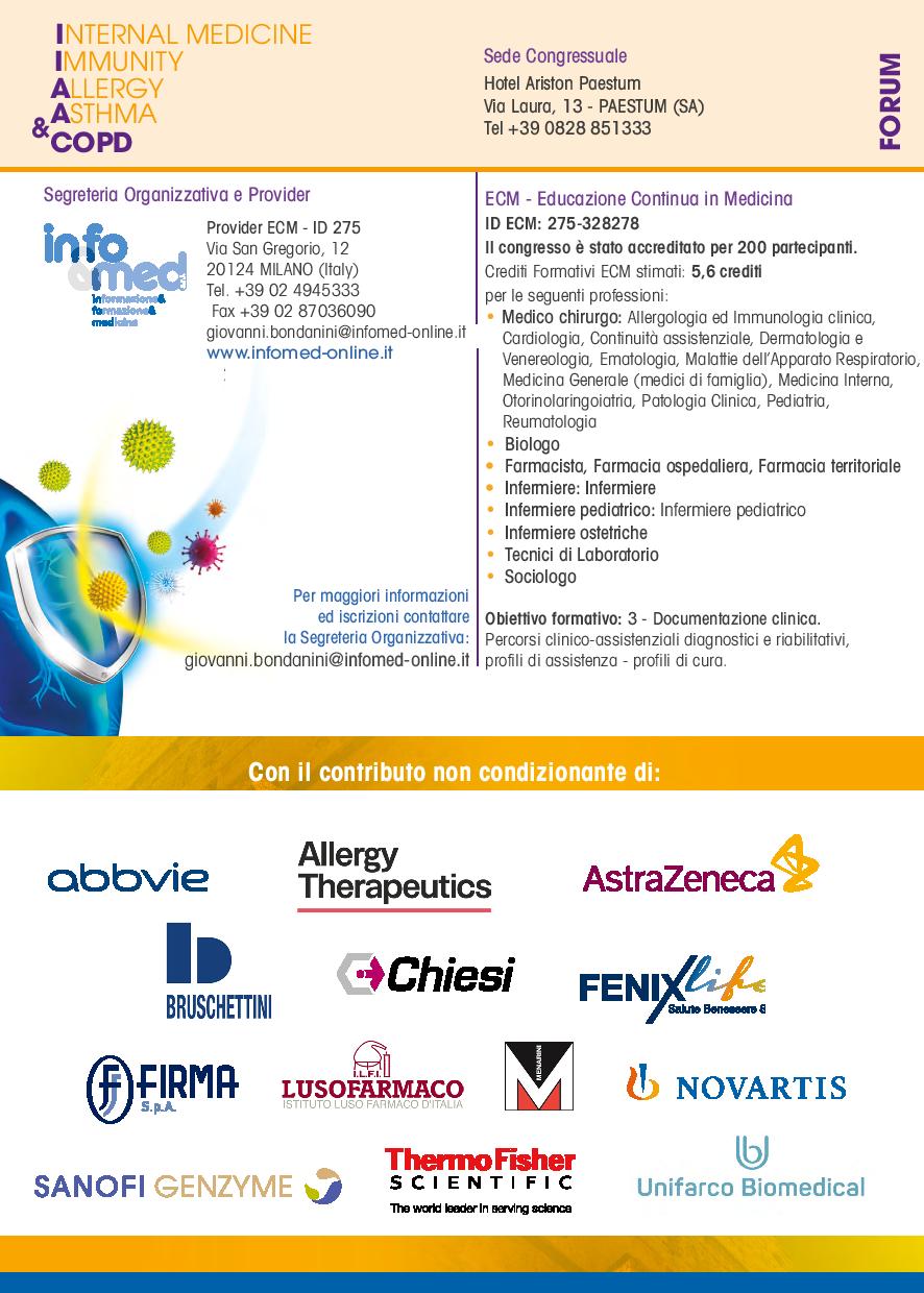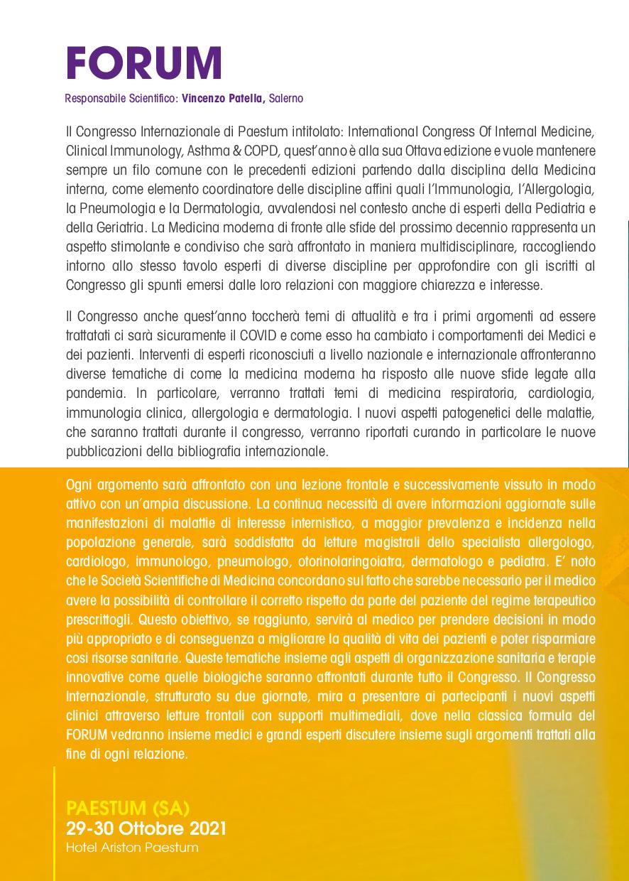 Il Forum International Congress Of Internal Medicine, Clinical Immunology, Asthma & COPD (Medicina interna, della immunologia clinica e delle malattie allergiche e dermatologiche immunomediate), organizzato dal prof. Vincenzo Patella di Salerno, Responsabile Scientifico del forum, insieme al Comitato Scientifico espresso dal Consiglio Esecutivo SIAAIC, è giunto alla sua ottava edizione.
