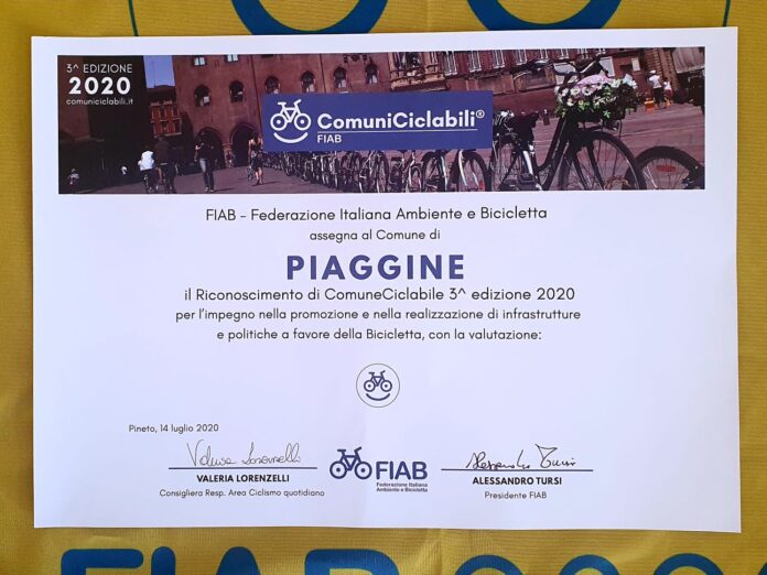 Il Comune di Piaggine diventa formalmente “comuneciclabile” ed entra a far parte della rete nazionale dei comuni ciclabili e del cicloturismo. Ieri pomeriggio, 14 luglio 2020, a Pineta in Abbruzzo, durante la III Edizione 2020, si è tenuta la cerimonia ufficiale di consegna del “Riconoscimento di ComuneCiclabile”, promosso dalla FIAB (Federazione Italiana Ambiente e Bicicletta), ritirato dal Sindaco di Piaggine Guglielmo Vairo con il quale viene premiato l’impegno nella promozione e nella realizzazione di infrastrutture e politiche a favore della bicicletta.