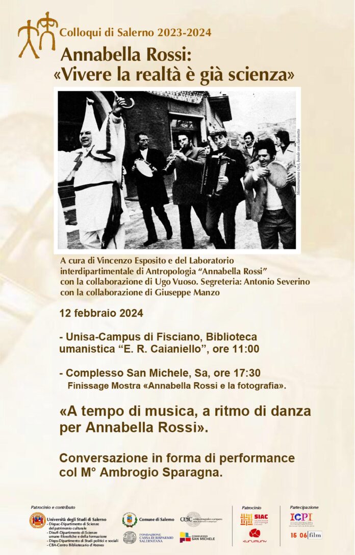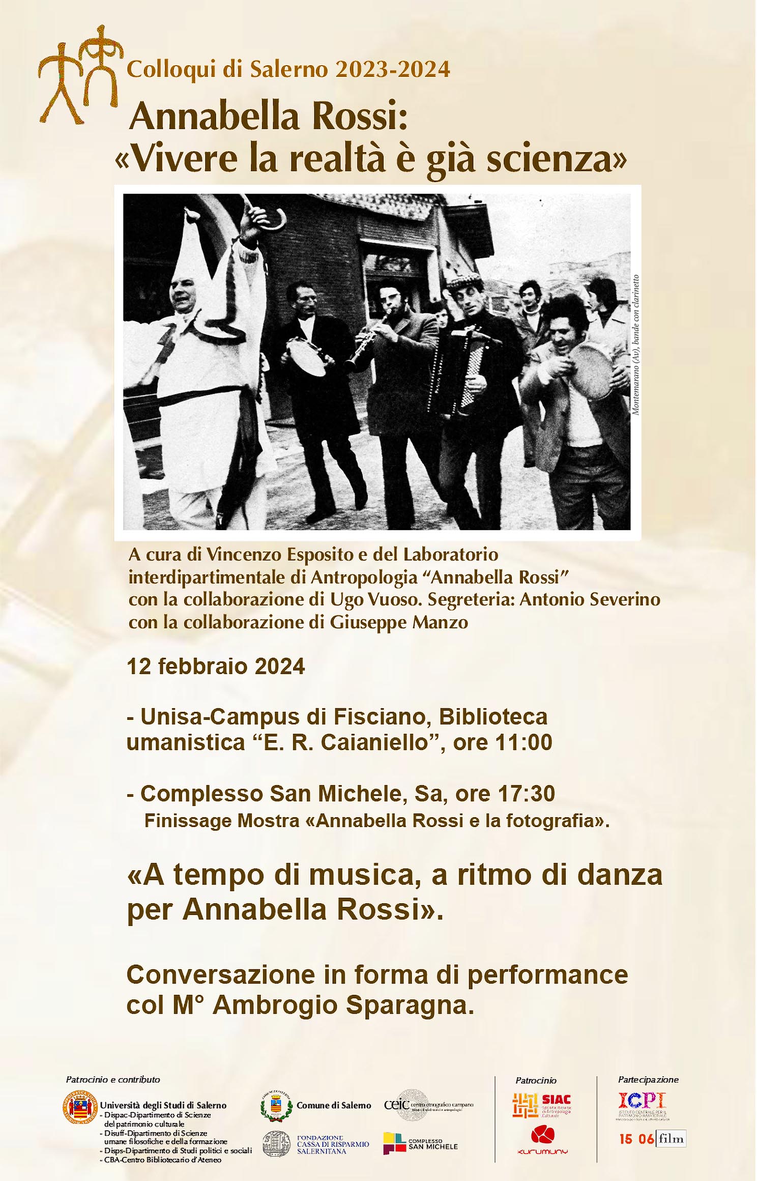 La manifestazione Colloqui di Salerno 2023-2024 – Annabella Rossi: ‘Vivere la realtà è già scienza’”, gode del patrocinio e del contributo dell’Università degli Studi di Salerno Dispac-Dipartimento di Scienze del patrimonio culturale, Disuff-Dipartimento di Scienze umane filosofiche e della formazione, Disps-Dipartimento di Studi politici e sociali, CBA-Centro Bibliotecario d’Ateneo e del Comune di Salerno e della Fondazione Cassa di Risparmio Salernitana. Hanno patrocinato l’iniziativa, che vede la partecipazione di 15 06|Film e dell’Icpi (Istituto centrale per il patrimonio immateriale del Ministero della Cultura), anche la Siac (Società italiana di antropologia culturale), il CEiC-Centro etnografico delle Isole campane (Istituto di Studi Storici e Antropologici) e Kurumuni Edizioni.