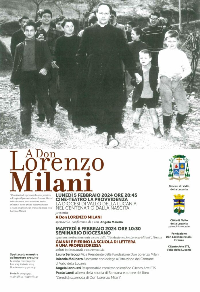 L’iniziativa, promossa da S.E. Rev.ma Monsignor Vincenzo Calvosa, Vescovo della Diocesi di Vallo della Lucania, in collaborazione con l’Associazione Culturale Cilento Arte – Ente Terzo Settore e con il patrocinio del Comune di Vallo della Lucania, si aprirà lunedì 5 febbraio al Teatro della Provvidenza (ore 20.45 – via Valenzana, 37) con lo spettacolo “A Don Lorenzo Milani”. Il monologo scritto e interpretato da Angelo Maiello si concentra sulla forza delle parole di Don Lorenzo e offre un’interpretazione fedele e appassionata della sua storia, a cominciare dal suo arrivo in bicicletta a Barbiana, basandosi fedelmente sui testi originali. Ne emerge il ritratto vivo di un uomo che ha avuto il coraggio etico di denunciare l’ingiustizia sociale e di incarnare la volontà comune di riscatto e libertà.