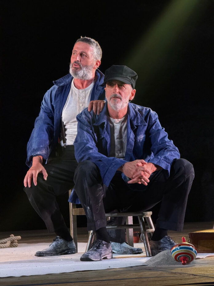 La vicenda immortale di Patroclo e Achille, rivisitata in preziose interpretazioni che vanno da Pasolini a Morante, da Anouilh a Cocteau, solo per citarne alcuni, prende in questa versione, quasi brechtianamente, nuova linfa e attualità. Essa mette in scena due scalpellini che si trovano a dover realizzare la lapide di Patroclo, da affiancare a quella del suo amato Achille. È il popolo, dunque, che sale alla ribalta: un coro tragico che diviene protagonista e veicolo delle varie voci di una guerra insensata; il senso più profondo, che muove lo scalpello sul marmo nell’accostare i due nomi, è sì nell’unione e nell’amore smodato, ma anche nelle laceranti differenze: chi è l’Uomo Migliore degli Achei (ariston acaion) ? Colui che ricerca la gloria nella “armonia che di mille secoli vince il silenzio”, usando i memorabili versi dei Sepolcri di Foscolo? Oppure l’uomo che depone le proprie speranze in una vita serena nel calore rassicurante degli affetti, ascoltando attorno al falò la canzone di chi più ama? Da questo presupposto parte l’originale versione di Alberto Bassetti, che prende le mosse primariamente da “La Canzone di Achille” di Madeline Miller e dallo studio delle opere di Eva Cantarella, così come dalle scritture classiche. Bassetti, dopo il successo di Edipo in Compagnia (anno 2014), e di Phaedra (anno 2016), completa un trittico di opere sul mito classico, coadiuvato da Tommaso Garré al suo debutto come regista che, formatosi artisticamente all’Inda di Siracusa e cresciuto nella compagnia di Sebastiano Lo Monaco, nel mito classico è nato. Lo spettacolo si pone dunque come profonda riflessione sul tema della ‘vita preferibile’, nonché su quello dell’amore nelle sue diverse sfaccettature e modalità, valore prezioso e mai discriminante, imprescindibile anche oltre la morte : perfino in essa, infatti, si può scegliere se accompagnarvisi, perché esso non si riduce ai vivi.