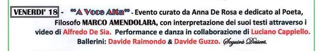 L’evento A VOCE ALTA non è, una pura e semplice commemorazione ma un bisogno di raccontare Marco e ridare voce alla sua poesia , a ciò che ci ha lasciato… MARCO AMENDOLARA non va dimenticato ma narrato alle nuove generazioni !
