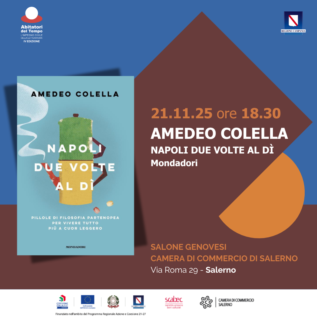 Venerdì 21 novembre, ore 18.30, presso il Salone Genovesi della Camera di Commercio di Salerno, sarà Amedeo Colella, autore de “Napoli due volte al dì” (Mondadori), ospite del quarto appuntamento della IV edizione della rassegna “Abitatori del tempo. L’impegno civile della letteratura”, il ciclo di incontri organizzato dalla Delia Agenzia Letteraria e dall’Associazione Culturale Mare Sole e Cultura con la collaborazione e il sostegno della Regione Campania e di Scabec, a valere sui Fondi Coesione Italia 21/27, e la Camera di Commercio di Salerno, che offre l’occasione per riflettere sui cambiamenti del nostro tempo e sui molteplici linguaggi per raccontarli.