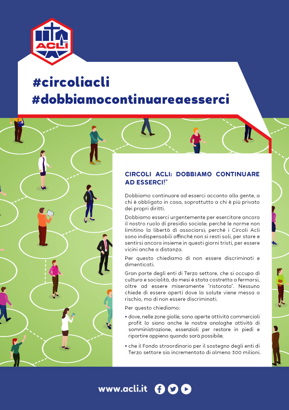 Tre giornate di mobilitazione, previste nei giorni dal 5 al 7 febbraio, per promuovere e dare forma alle richieste che le ACLI ed ARCI nazionali, hanno rivolto alla politica ed al Governo nazionale affinché i Circoli, nel rispetto delle norme di sicurezza, possano riaprire e continuare a svolgere la loro attività di promozione sociale, educativa e di presidio dei diritti e tutele delle comunità.