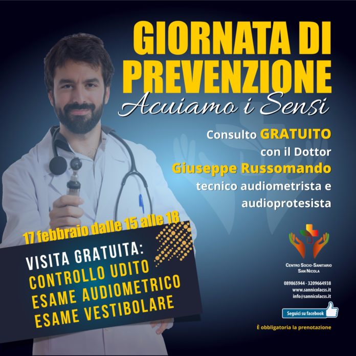 Sabato 17 febbraio, a partire dalle ore 15.00, il dottor Giuseppe Russomando effettuerà gratuitamente, previa prenotazione, il controllo dell’udito con esami audiometrici e vestibolari.