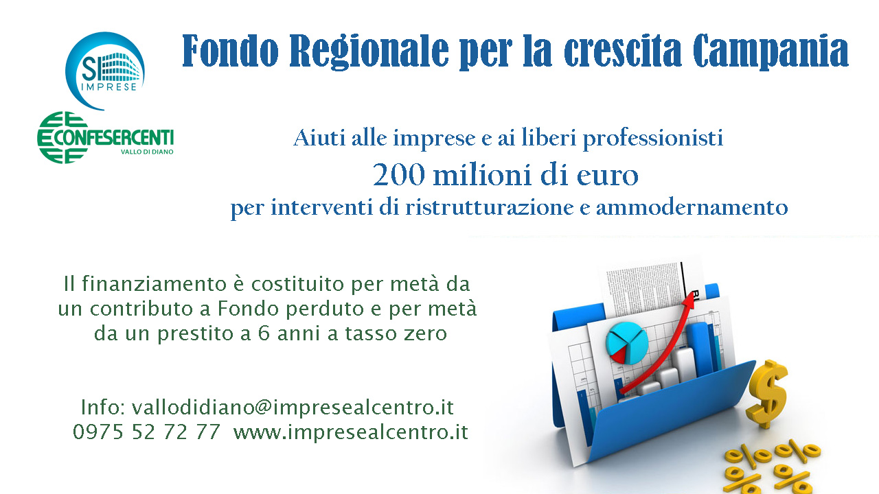 “Il Fondo Regionale per la crescita Campania – ha spiegato la presidente di Confesercenti Vallo di Diano, Maria Antonietta Aquino – è uno strumento finanziario messo a punto dalla Regione Campania e gestito da Sviluppo Campania per l’ammodernamento, la digitalizzazione e il miglioramento delle piccole e medie imprese campane e dei nostri professionisti nell’era della transizione 4.0. E’ un contributo misto, per metà a fondo perduto e per metà a tasso 0. Bisogna presentare un progetto e un business plan importante e noi come Confesercenti abbiamo già strutturato uno staff competente e preparato per poter assistere e seguire questo tipo di progettualità, certi che strumenti come questo devono aiutare le nostre aziende a fare quel salto di qualità necessario per crescere nel migliore dei modi in una nuova era definita 4.0. Rivolgetevi ai nostri uffici presenti a Sala Consilina, accanto alla Banca Monte Pruno e ai prossimi futuri uffici che saranno aperti a Polla, per avere una consulenza dettagliata sulla misura”.