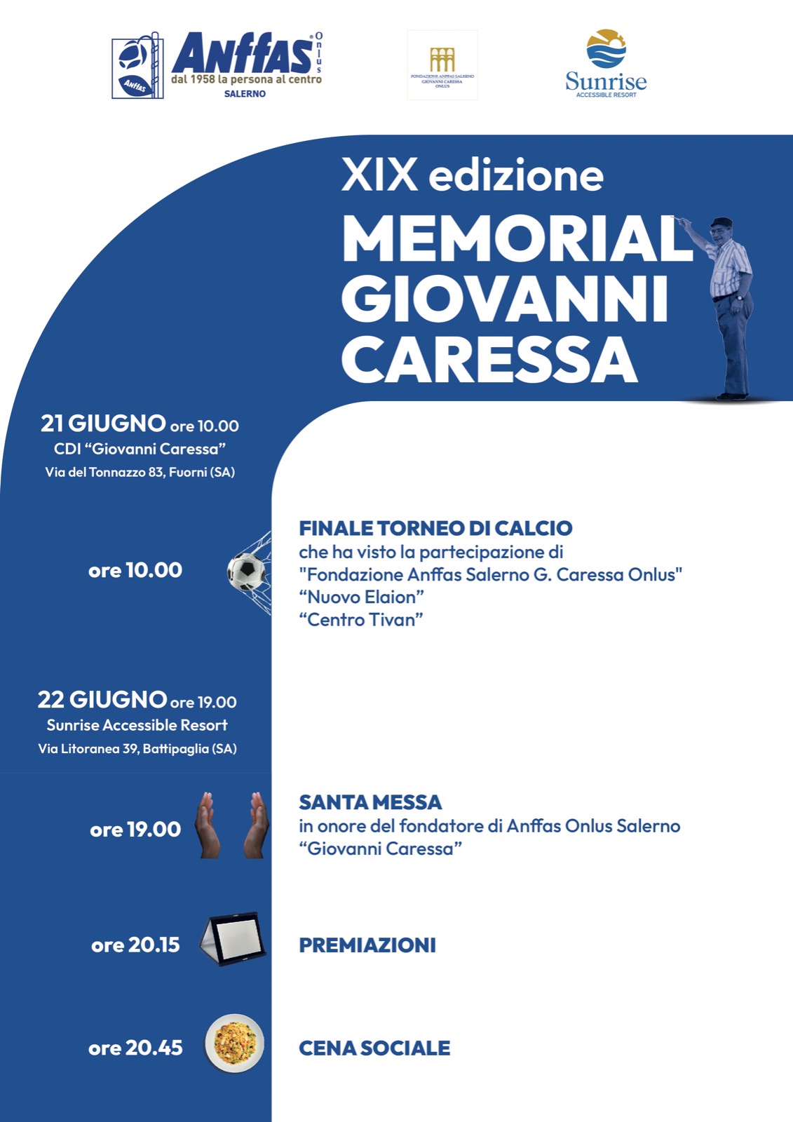 Il Memorial G. Caressa, sarà preceduto da una giornata di sport e divertimento, mercoledì 21 giugno alle ore 10 presso il CDI G. Caressa di Fuorni per la conclusione del torneo di calcio a 5, un triangolare di calcio tra la squadra della Fondazione Anffas Salerno Giovanni Caressa e i centri di riabilitazione Nuovo Elaion e Tivan che si chiuderà con la finale, la premiazione delle squadre e l’assegnazione delle targhe ai premi allo sport, dopo aver disputato partite emozionanti, competizioni leali e l’opportunità di mostrare il meglio di sé sul campo con grinta e determinazione.