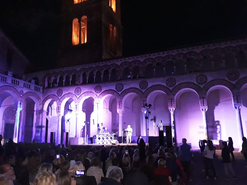 Poi il buio, illuminato soltanto dalla luna piena che fa capolino tra le bifore del maestoso campanile normanno tra i suoni elettronici di Paky De Maio in un’atmosfera quasi spaziale.