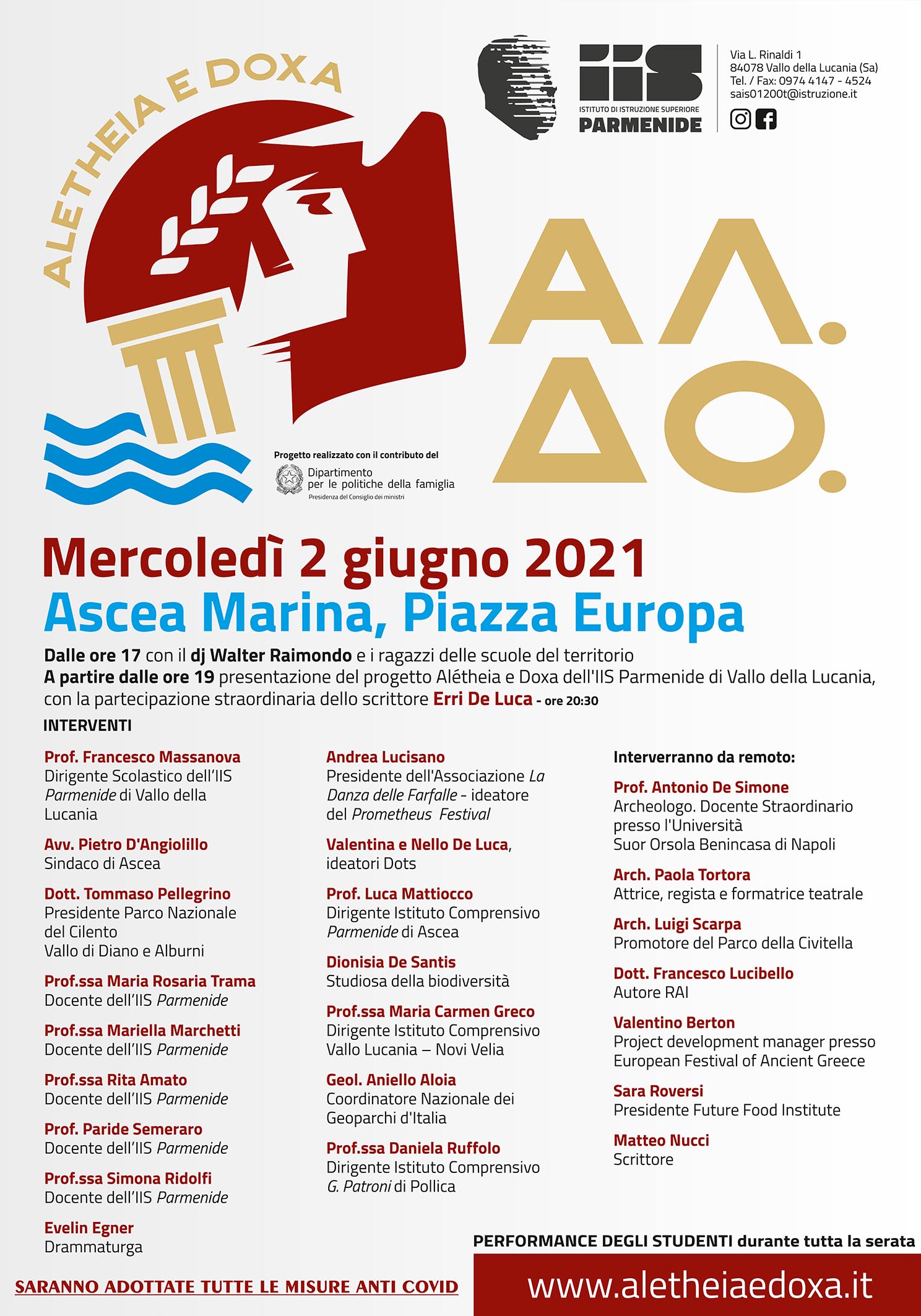 Prenderanno il via mercoledì 2 giugno alle ore 17,00 in piazza Europa ad Ascea Marina le attività connesse al progetto semestrale “Alétheia e Doxa”, promosso dal Dipartimento per le politiche della Famiglia nell’ambito del Bando “Educare”, fortemente voluto dal professor Francesco Massanova, Dirigente scolastico dell’Istituto di Istruzione Superiore “Parmenide” di Vallo della Lucania, e redatto dalla professoressa Maria Rosaria Trama, destinato agli studenti, protagonisti attivi del proprio processo di apprendimento e attori della scena educativa.