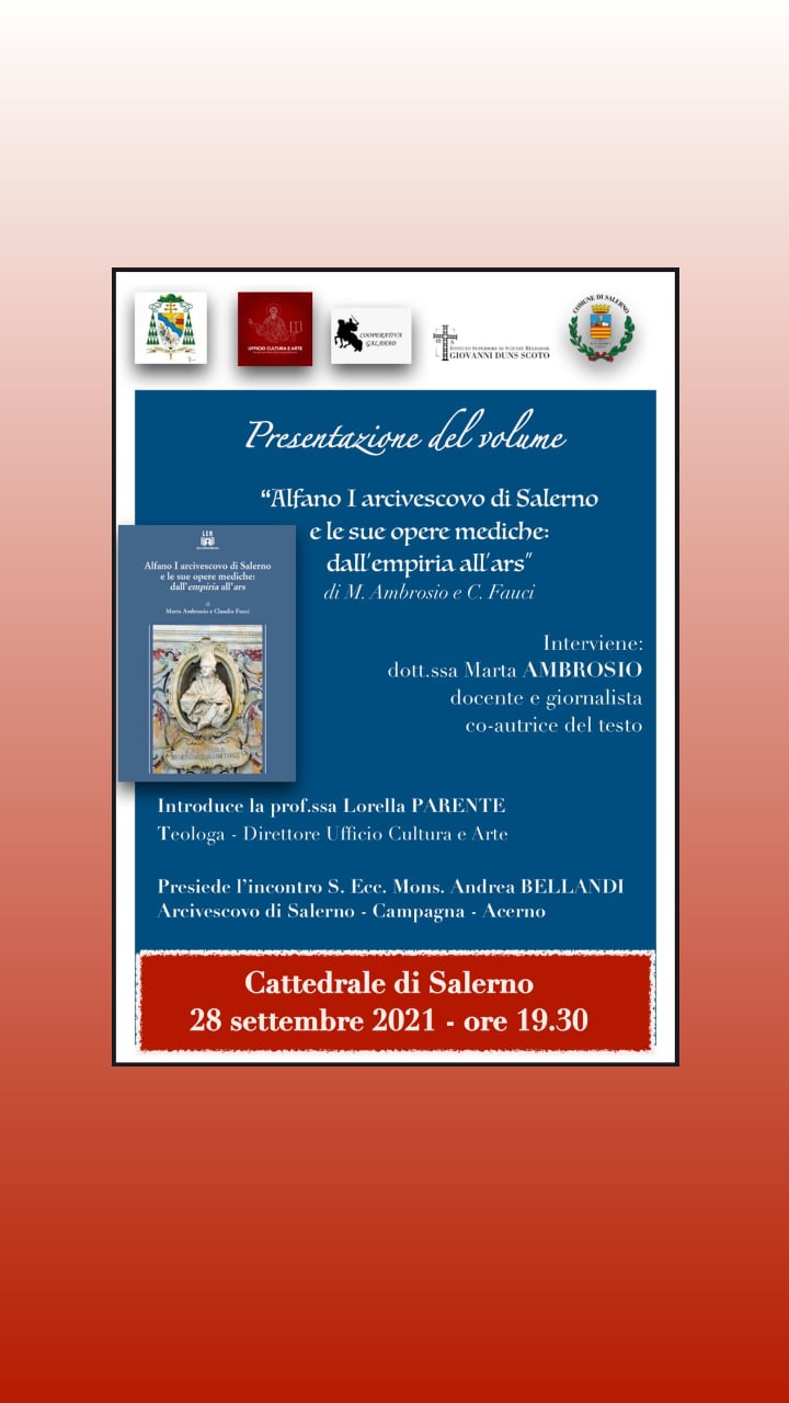 Martedì 28 settembre alle ore 19:30 al Duomo di Salerno verrà presentato il volume storico “Alfano I Arcivescovo di Salerno e le sue opere mediche dall’empiria all’ars” curato da Marta Ambrosio e Claudia Fauci.