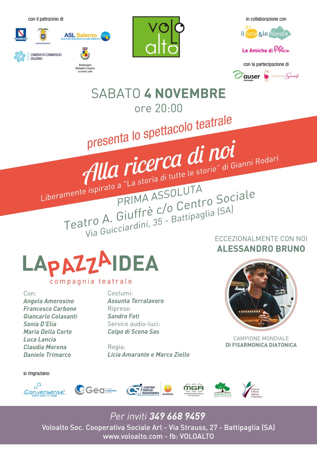 Si terrà sabato 4 novembre prossimo, alle ore 20.00, presso il teatro Aldo Giuffré di Battipaglia, la prima assoluta dello spettacolo teatrale “Alla ricerca di noi”, frutto del laboratorio di teatro sociale ideato e condotto dalla coop. Voloalto da oltre un ventennio.