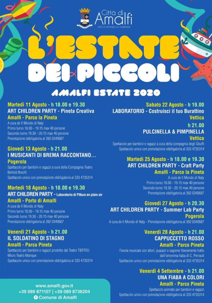 La consigliera delegata alle politiche dell’infanzia Francesca Gargano, che ha promosso il cartellone in collaborazione con l’assessore agli eventi Enza Cobalto, dichiara: “ Il programma dell’Estate dei Piccoli, così come l’Amalfi Junior Summer Camp iniziato a luglio, per il 2020 è un pensiero particolare che vogliamo dedicare ai bambini, che negli ultimi mesi sono stati così bravi nel rispettare le misure in vigore, nell’affrontare una prova che è stata difficile anche per gli adulti. Con questi appuntamenti all’aperto, vogliamo dare loro, e alle loro famiglie, la possibilità di vivere, nel rispetto delle misure di distanziamento, i momenti di gioco e i laboratori ai quali erano abituati e che per ogni estate hanno atteso con impazienza.”. Si rinnova così anche per questa estate la consuetudine instaurata dall’amministrazione comunale guidata dal sindaco Daniele Milano di dedicare una serie di eventi esclusivamente ai più piccoli, oltre a quelli dedicati agli adulti che per quanto attiene al 2020 saranno presentati nei prossimi giorni.