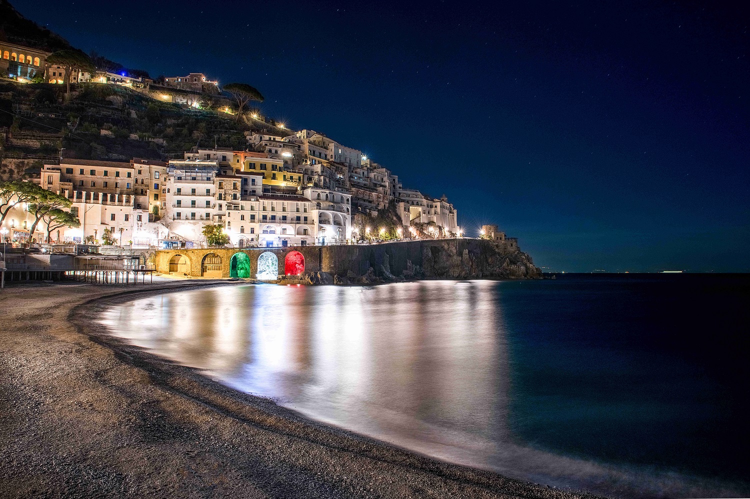 “Ritorneremo a splendere!”. Un messaggio di speranza che parte da uno dei paesaggi simbolo dell’Italia nel mondo. Ad Amalfi l’amministrazione comunale guidata dal sindaco Daniele Milano ha fatto illuminare con il verde, bianco e rosso della bandiera italiana le arcate della Marina Grande.