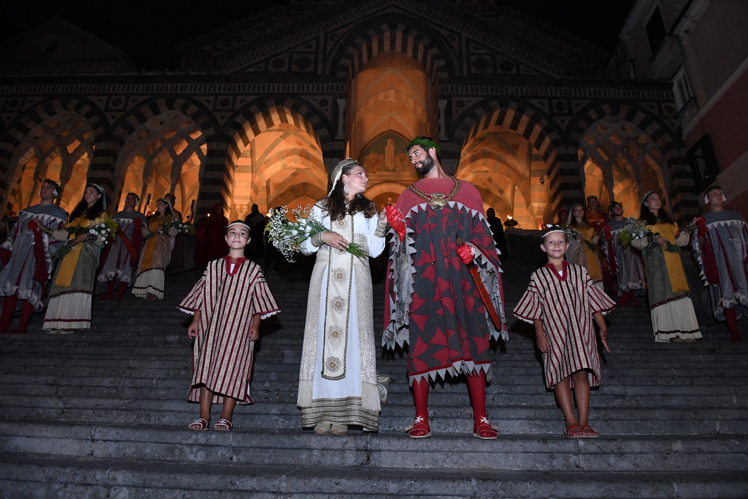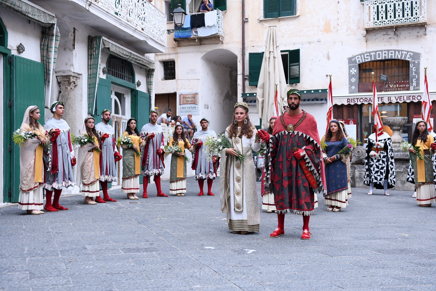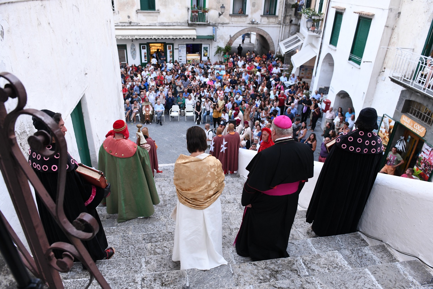 L’investitura, avvenuta dopo che il sontuoso corteo storico rievocativo ha attraversato l’intero centro di Amalfi ed ha raggiunto Atrani, ha seguito l’antico rito dell’incoronazione dei Duchi di Amalfi. Dopo i saluti del sindaco di Atrani Luciano de Rosa Laderchi e del sindaco di Amalfi Daniele Milano, che ha dato lettura in italiano della motivazione dell’assegnazione del riconoscimento, c’è stato il momento dell’investitura, con la lettura della formula rituale in latino da parte dell’arcivescovo della diocesi di Amalfi – Cava monsignor Orazio Soricelli e la vestizione della stola, scelta in luogo della cappa finora utilizzata per gli uomini.
