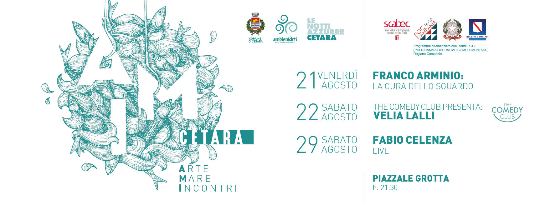 Ad inaugurare la rassegna sarà il poeta-paesologo Franco Arminio che, alle 21.30 di venerdì 21 agosto, in Piazzale Grotta, presenta “La cura dello sguardo”. Il programma prosegue, sabato 22 agosto, stesso posto stessa ora, con lo show “Una donna senza qualità” di Velia Lalli, in collaborazione con The Comedy Club Italia. Resa nota dalla trasmissione in onda su Raidue ‘”Sbandati’”, la comica è ritenuta la prima stand up comedian donna d’Italia. Laureata in Ingegneria Elettronica presso l’Università Roma Tre, La Lalli è appassionata di canto e musica jazz, tanto da aver anche tentato quella strada. Nel suo quinto monologo, “Una donna senza qualità”, prova a chiudere il cerchio, dopo aver fatto bilanci ad ogni Capodanno, ogni anno dopo le ferie estive, al passaggio di ogni decade e, persino, in ogni suo monologo, rifugiandosi ancora una volta nella risata, per accettare tutti i fallimenti delle sue ambizioni. Con un attacco aperto alla comicità femminile nazionale, Velia dichiara di essere una nicchia, dove la donna ha come arma una grassa risata, libera e consapevole, che non passa attraverso la critica trita del maschio. Nel momento in cui si parla tanto di donne, lei le vuole armate dell’arma più potente che conosce: la goliardia, fornendo un prontuario di battute sferzanti da appuntarsi e utilizzare in caso di “necessità”. Col supporto dei ristoratori e produttori di Cetara, gli eventi offrono la possibilità di partecipare a un percorso eno-gastronomico, con degustazione di prodotti tipici e specialità, a partire dalle 19. A chiudere il ciclo di incontri sarà Fabio Celenza, il re del web per i suoi doppiaggi no-sense, in programma sabato 29 agosto, con un attesissimo live.