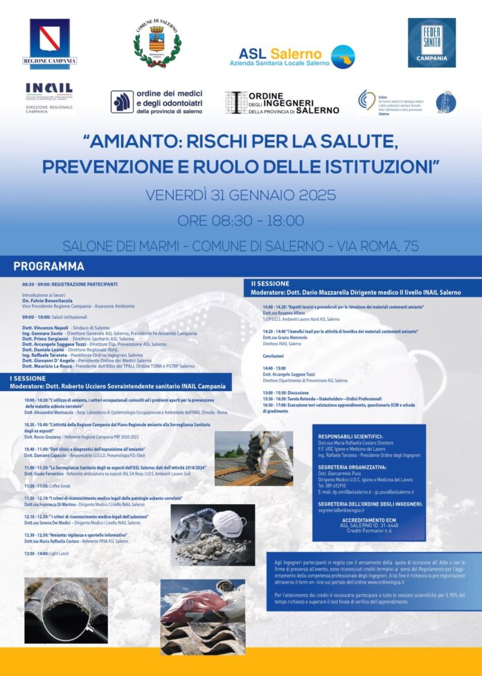 Realizzato nell’ambito del Piano Regionale della Prevenzione 2020/2025, relativamente al Programma Predefinito 08, per l’aspetto dedicato alla prevenzione del Rischio cancerogeno nei luoghi di lavoro, l’evento si avvale del patrocinio della Regione Campania, dell’Inail Regionale, del Comune di Salerno, di Federsanità Campania, dell’Ordine degli Ingegneri, Ordine dei Medici, Ordine dei Tecnici di radiologia medica e delle professioni sanitarie tecniche della riabilitazione e della prevenzione della Provincia di Salerno.