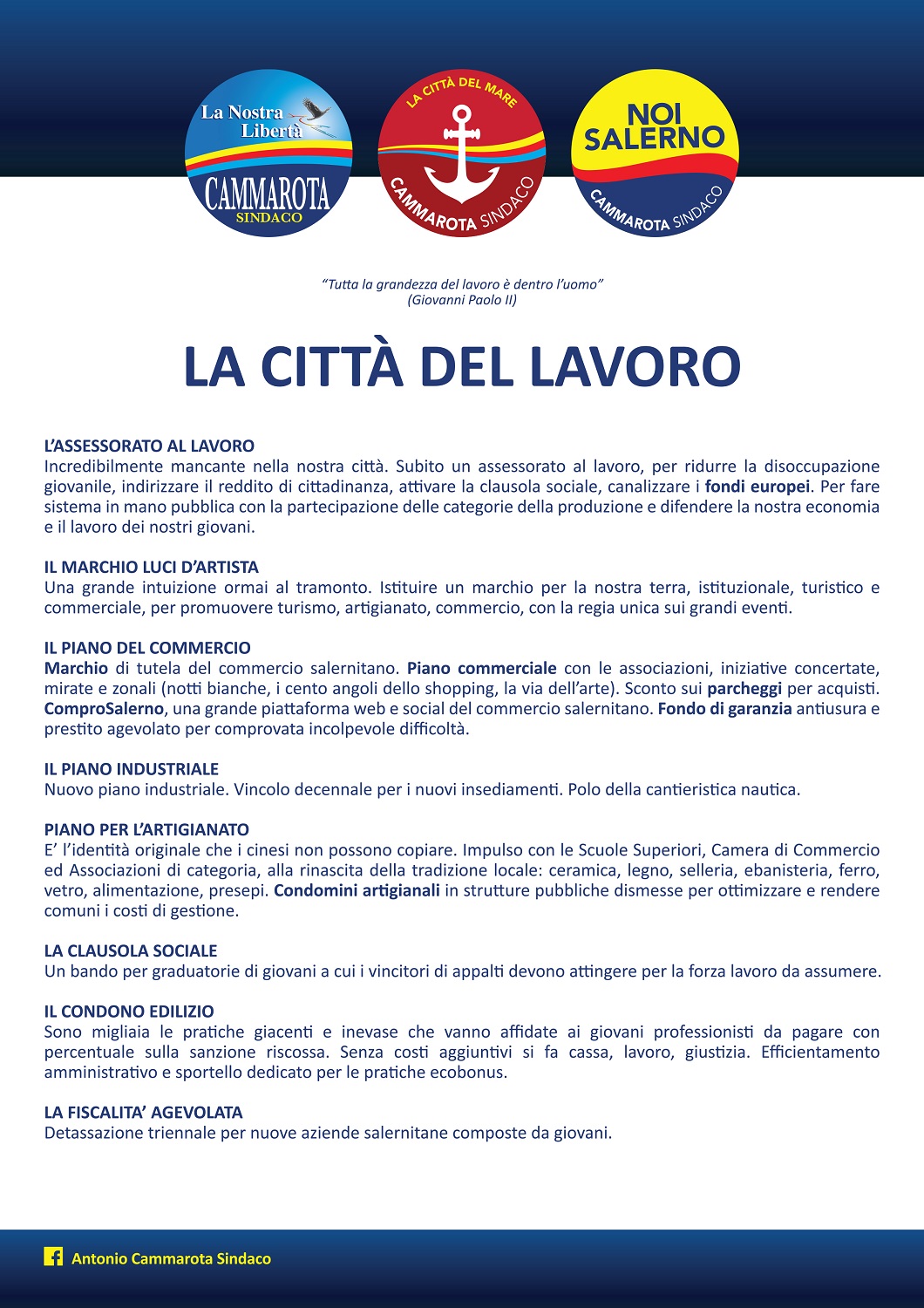 “Fare sistema significa creare dei marchi di tutela: per le Luci d’artista fu proposto nel 2013. E ancora, per l’artigianato: si pensi alla ceramica che è nata qui o alla tutela dell’uva Sanginella, al marchio del commercio, con iniziative mirate, della moda e del fashion, per creare la città del talento, una struttura fissa di formazione delle arti e dello spettacolo. Quindi l’assessorato al lavoro che oggi manca, che faccia da collante e sia la parte pubblica con le categorie private, per la produzione, per difendere il lavoro dei nostri giovani attraverso la clausola sociale. Chi vince bandi, commesse, appalti deve destinare una percentuale ai nostri giovani sulla base di una graduatoria ad evidenza pubblica”, conclude Cammarota.