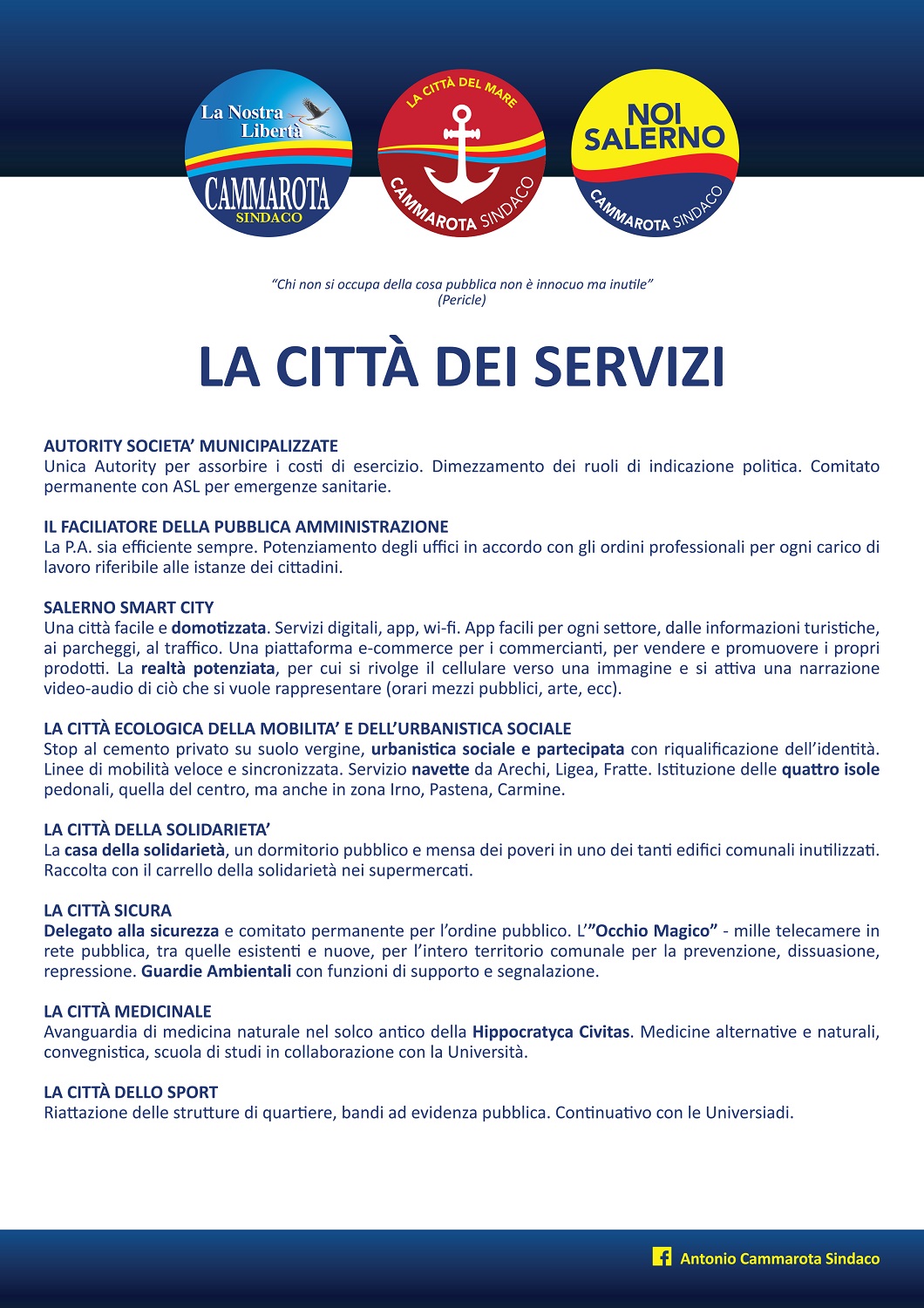 “Occorre fare sistema per difendere la nostra economia, valorizzare la nostra identità ma soprattutto darne una precisa a Salerno”, prosegue Cammarota. “Salerno, in questo momento, non è né carne né pesce. Deve sintetizzare nella città del mare il suo sviluppo a tutti i livelli. Con l’industria nautica, con i grandi eventi per mano pubblica, la promozione del turismo marino e la movida del mare. Tutto questo, oggi, non c’è in una città che non ha neppure l’assessorato al turismo. Con noi ci sarà anche quello del mare. La realtà aumentata, come avviene ad Oliveto Citra, quale strumento innovativo, pratico e tecnologico di sviluppo e promozione del territorio per conoscere tutte le sue caratteristiche, informazioni e bellezze. Ancora il commercio, il suo sviluppo e la sua valorizzazione anche con la creazione di isole pedonali nei quartieri per dare respiro alle attività produttive. Si pensi al Carmine, Pastena o via Irno”, prosegue ancora Cammarota.