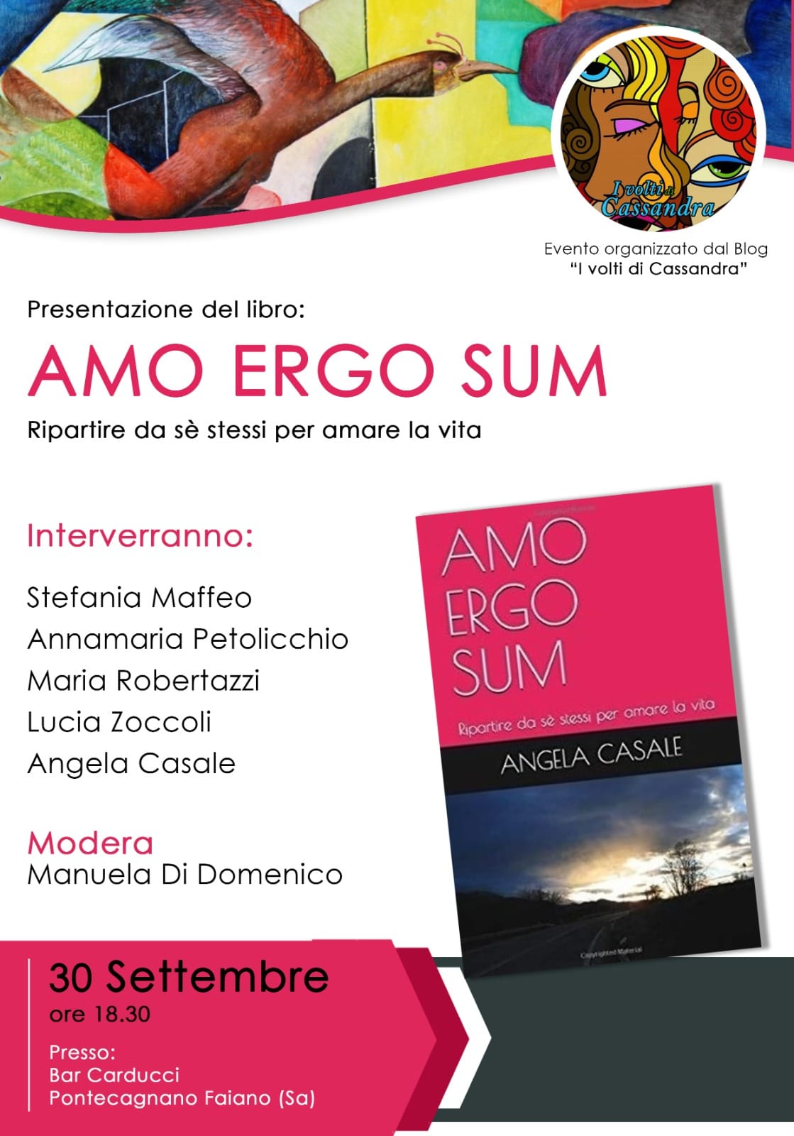 Mercoledì sera alle 18:30 presso il Carducci Cafè a Pontecagnano Faiano, si à la prima presentazione ufficiale del libro “Amo ergo Sum – Ripartire da sé stessi per amare la vita” di Angela Casale. Pubblicato a fine giugno, a causa delle restrizioni relative al Covid, non è stato possibile presentarlo ufficialmente. Il libro, in vendita su Amazon e presso Mondadori BookStore al CC. La Fabbrica, potrà essere acquistato anche alla presentazione, che sarà accompagnata da un aperitivo.