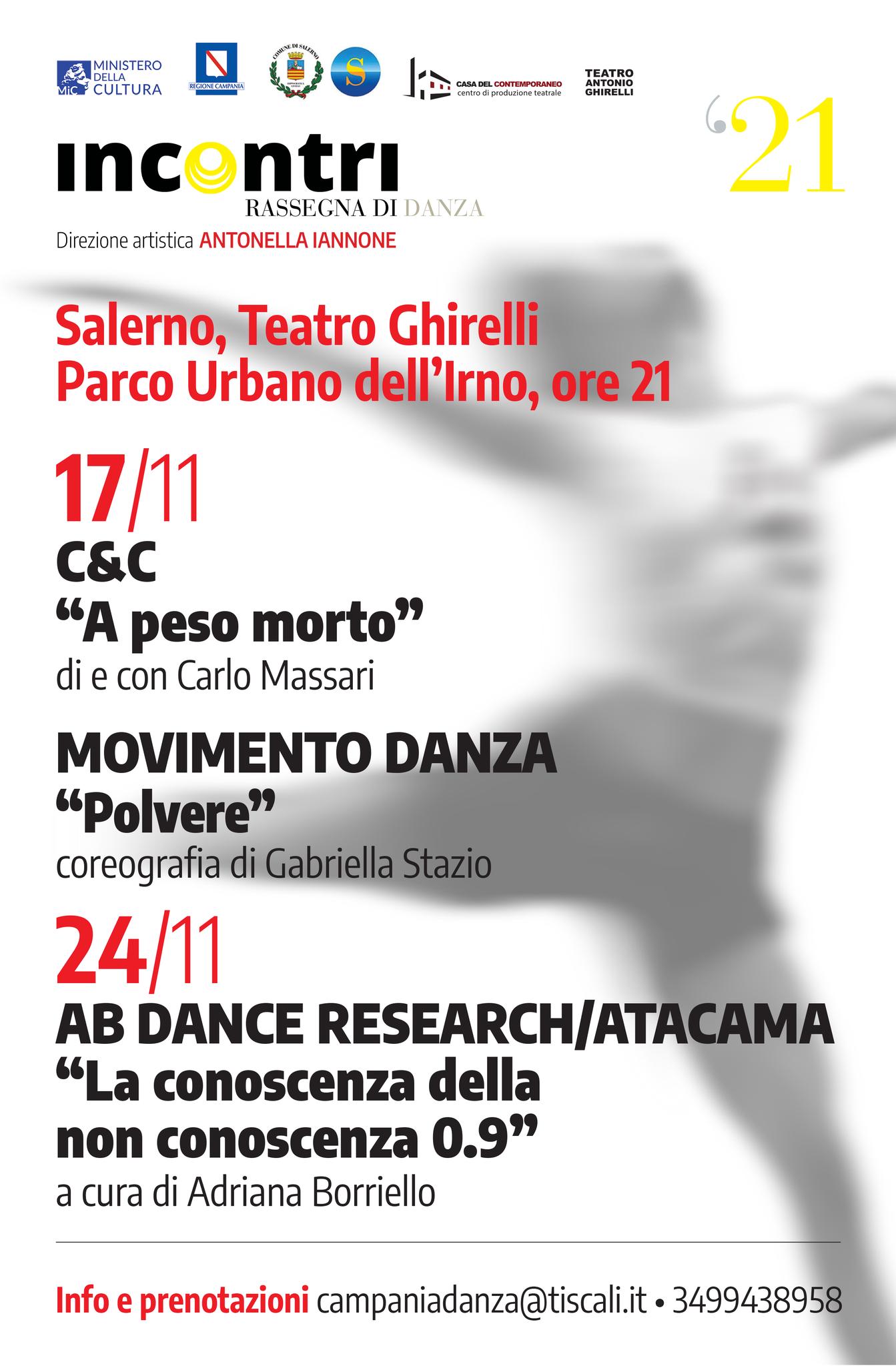 L’edizione 2021 della rassegna di danza contemporanea “Incontri” è organizzata dall’Associazione Campania Danza e realizzata in collaborazione con Bimed e Casa del Contemporaneo e con il sostegno della Regione Campania e patrocinio del Comune di Salerno, del Comune di Vallo della Lucania e del Comune di Gioi Cilento. La rassegna è tra i progetti italiani ad aver ottenuto l’importante riconoscimento del MiC che sostiene l’iniziativa. La direzione artistica è di Antonella Iannone.
