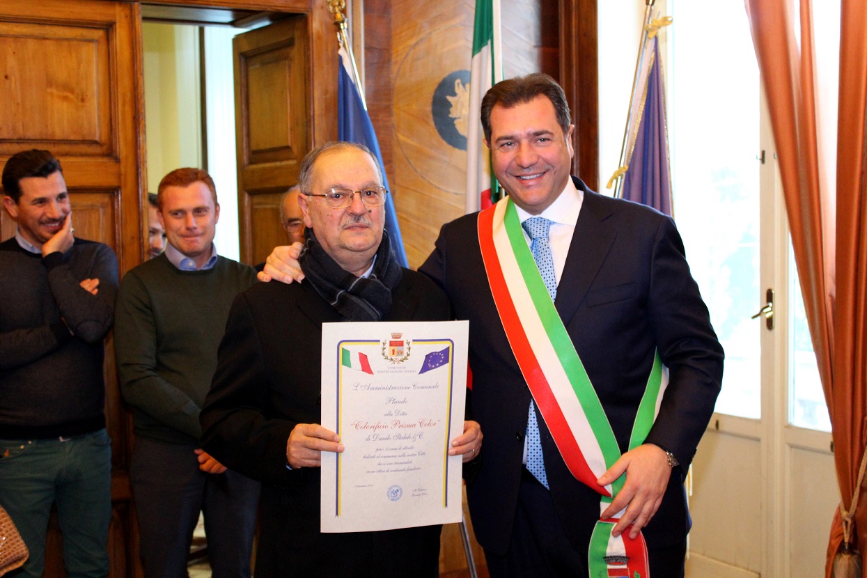 “Alla Ditta ‘Colorificio Prisma Color’ di Danilo Stabile & C. per i 51 anni di attività dedicati al commercio nella nostra Città che si sono tramandati in un’ottica di continuità familiare”;