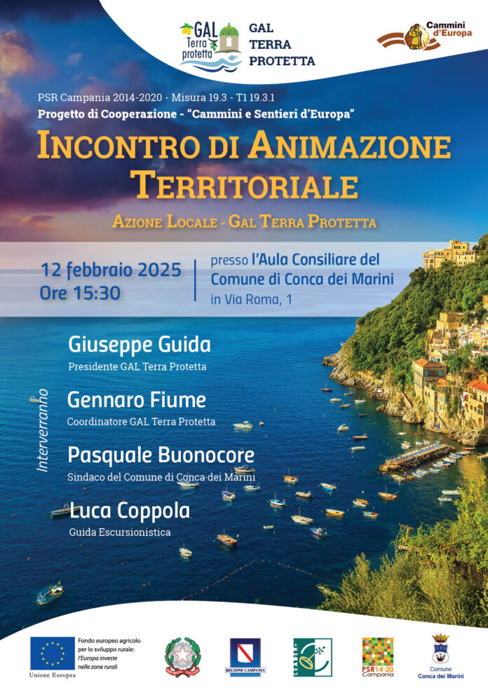 “Cooperazione”, il GAL Terra Protetta è lieto di invitarVi all’incontro di animazione territoriale tra stakeholders locali ed operatori turistici operanti sul territorio, che si terrà in data mercoledì 12 Febbraio 2025, presso la Sala Consiliare del Comune di Conca dei Marini Via Roma n. 1 – 84010 – Conca dei Marini (SA) – alle ore 15:30.