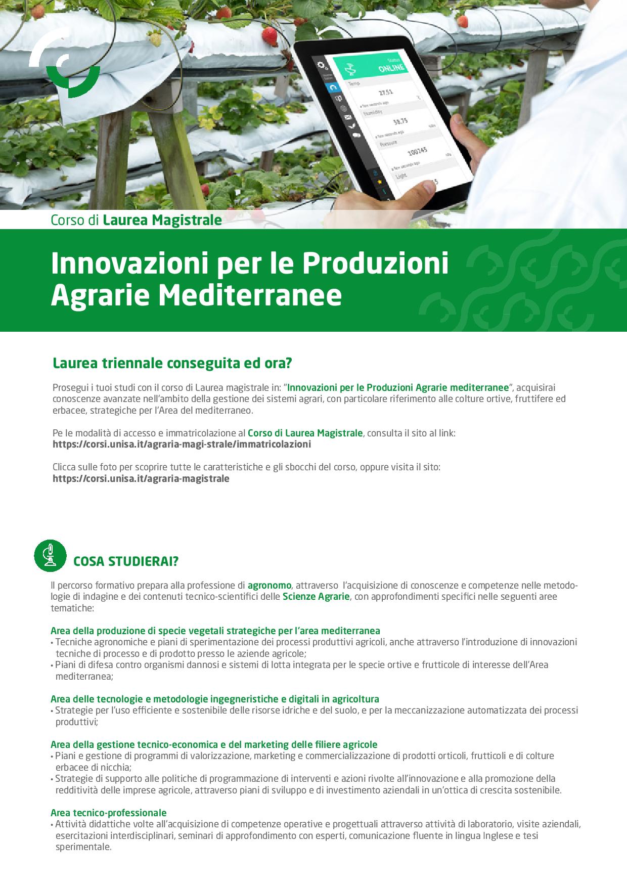 Il Corso fornisce una conoscenza scientifica multidisciplinare e prepara alla professione di Tecnico agronomo. Si acquisiranno competenze nelle agrotecniche innovative, nel miglioramento e nella valorizzazione delle produzioni agricole della qualità dei prodotti agroalimentari, oltre alla preparazione specialistica per la difesa delle piante, conservazione della biodiversità, gestione del verde pubblico e privato e delle aree protette, bioeconomia anche utilizzando le tecniche dell’agricoltura digitale. Il tutto accompagnato da esercitazioni in campo e in laboratorio