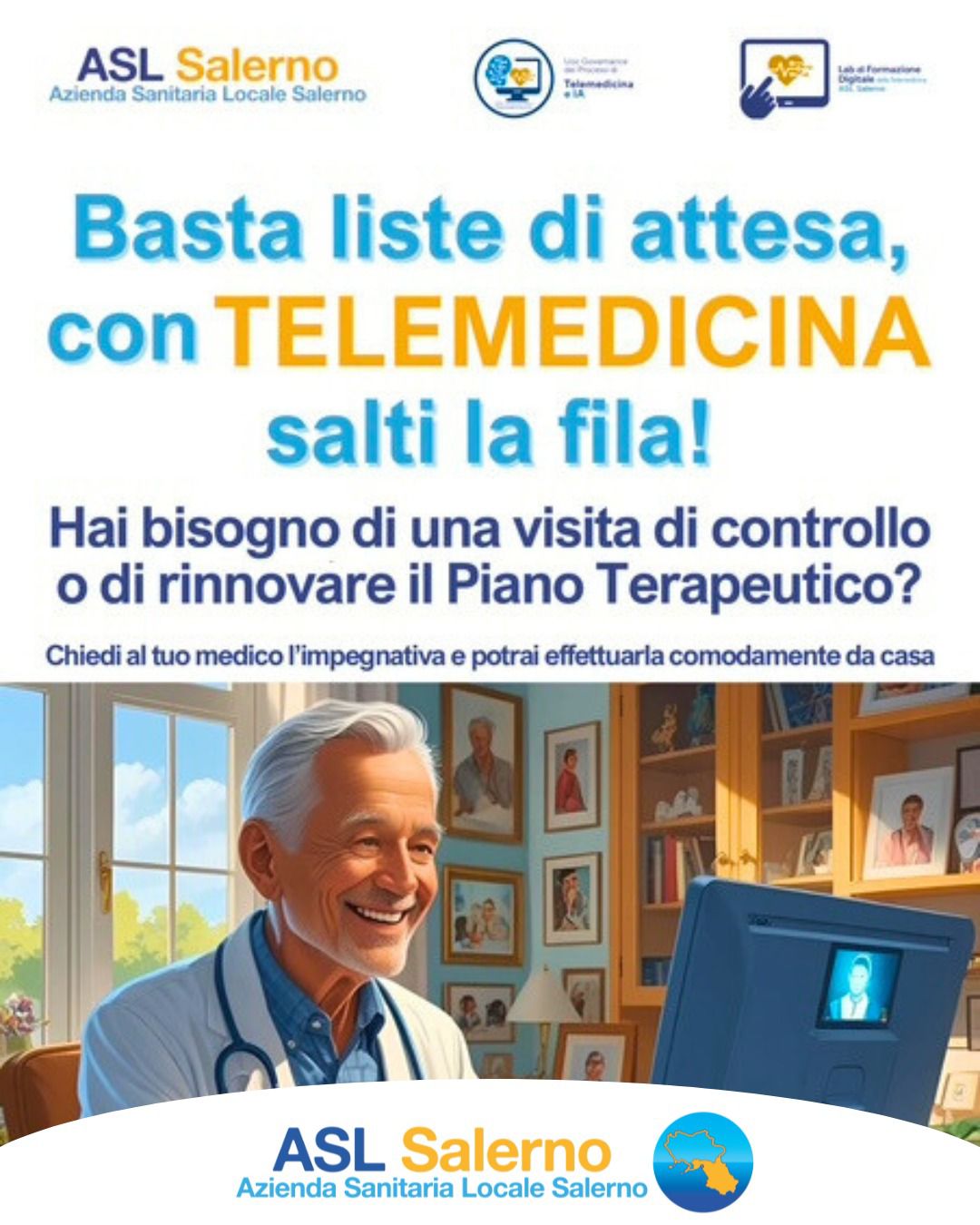 A partire da martedì 16 settembre 2025 presso l’ASL Salerno sarà possibile prenotare una “Televisita”, una visita medica specialistica che si svolge a distanza, in videochiamata ed in tempo reale, che ha lo stesso valore e le stesse finalità di una visita fatta in presenza.