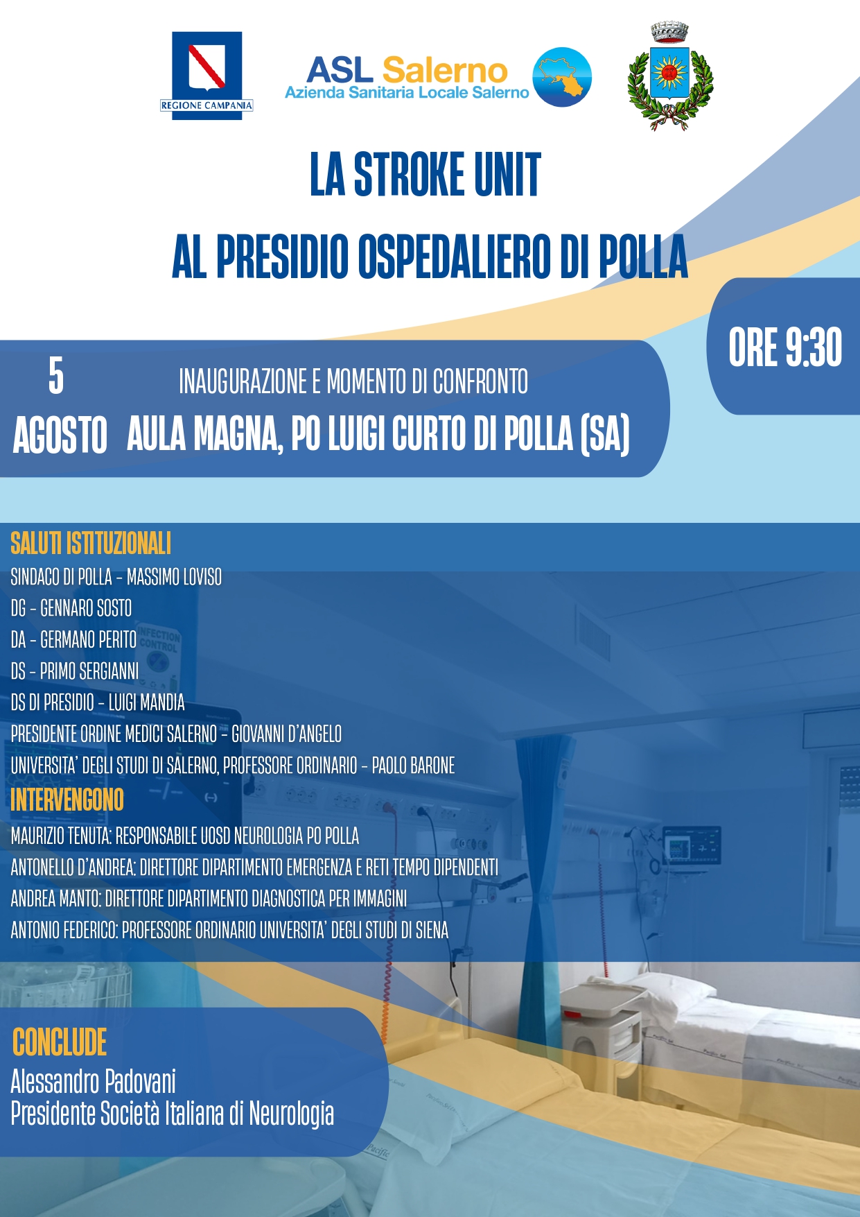Il 5 agosto prossimo, alle ore 9:30, all’ospedale “Luigi Curto” di Polla, si terrà l’apertura della Stroke Unit nel reparto di Neurologia del responsabile Maurizio Tenuta.