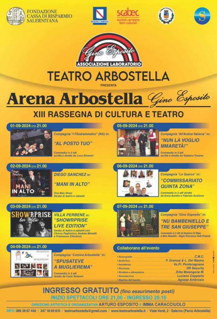 Tutto pronto per la XIII edizione dell’Arena Arbostella premio Gino Esposito, sette giorni di teatro ed eventi all’aperto nella zona orientale di Salerno. La rassegna, ideata 13 anni fa dal compianto direttore artistico del Teatro Arbostella Gino Esposito, sarà come sempre ad ingresso gratuito e si terrà nello spazio antistante il teatro nelle serate dall’1 al 7 settembre 2024.