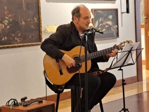 La professoressa Clara Mattia Cuoco ha iniziato la seconda parte della serata recitando la delicata e suggestiva poesia “Nannina “ di Salvatore Di Giacomo e introducendo il chitarrista Matteo Cantarella che ha ricordato come, nel 1537, grazie alle villanelle cominciò a prendere forma e sostanza la canzone napoletana:” La prima raccolta stampata di villanelle pervenutaci è una riedizione eseguita a Napoli a cura di Giovanni da Colonia e reca la data del 23 Ottobre 1537: viene considerata l’atto di nascita ufficiale della villanella e quindi della canzone napoletana. È conservata nella “Herzogliche Bibliotek” di Wolfenbuttel in Germania”. Cantarella, chitarrista autodidatta, è un grande appassionato di musica napoletana: ha fatto parte di diverse formazioni in ambito pop, specializzandosi nell’esecuzione del genere classico napoletano e della musica tradizionale. Tra gli altri, ha fatto parte del gruppo folklorico de “I Castellani di Giovi” e della “Piccola Orchestra Popolare i Musicantica. Il chitarrista salernitano che insegna Lettere all’IIS “Della Corte Vanvitelli” di Cava dei Tirreni, diretto dalla Dirigente Scolastica Franca Masi, si è laureato discutendo una tesi in Letteratura italiana proprio sulla poesia e il dialetto di Salvatore Di Giacomo e Ferdinando Russo. Durante la serata, coinvolgendo il pubblico, ha cantato brani dell’800 di Gaetano Donizetti: “Me voglio fa’ na casa mmiezz’ ‘o mare” e “Io te voglio bene assaie” il cui testo è stato scritto nel 1835 dal poeta e scrittore Raffaele Sacco. Cantarella, con la sua voce armoniosa , delicata e profonda, ha poi interpretato brani classici come “Palomma ‘e notte” di Salvatore Di Giacomo e Francesco Buongiovanni, del 1907; “Presentimento” di E.A.Mario, del 1918 e “N’accordo in fa” scritta nel 1927 da Gigi Pisano e musicata da Nicola Valente, che fu cantata con successo anche da Renato Carosone con il pianista Gegè Di Giacomo che Cantarella ha conosciuto:” Mi consigliò di indossare sempre una camicia bianca durante i miei recital”. Consiglio non ascoltato visto che Cantarella indossava invece una camicia di colore nero, come lui stesso ha fatto notare prima di cantare “Munasterio ‘e Santa Chiara” di Alberto Barberis e Michele Galdieri, del 1945:” Fu la prima canzone scritta nel dopoguerra”. Cantarella ha interpretato tante altre canzoni classiche napoletane: da “ Me so’ mbriacato ‘e sole” a “Cerasella”; da “Chella llà” a “Paese mio” di Peppino De Filippo, a “Carmela” di Sergio Bruni:” Il poeta Salvatore Palomba che scrisse il testo musicato da Sergio Bruni, affermò che dietro l’identità di Carmela vi era tutta Napoli”. Cantarella ha concluso il suo recital interpretando le canzoni umoristiche napoletane come “E allora?” di Armando Gill, del 1926; “Canzone pettegola” di Boselli e Iglio del 1971. Il bis, richiesto a gran voce dal pubblico, è stato dedicato a un capolavoro della canzone napoletana:” Era de maggio” di Salvatore Di Giacomo.