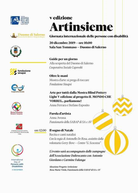 Venerdì 20 dicembre 2019, alle ore 10.00, presso la Sala San Tommaso del Duomo di Salerno si terrà la V Edizione di Artinsieme organizzata, in occasione della Giornata internazionale dei diritti delle persone con disabilità, dalla Soprintendenza ABAP di SA e AV, diretta da Francesca Casule, con il patrocinio del Comune di Salerno, in collaborazione con il Duomo di Salerno, Parrocchia SS. Matteo e Gregorio Magno, con la Fondazione Sinapsi di Cava de’ Tirreni, con il Centro Socio Educativo Guido Scocozza di Salerno della Rete Solidale Campania e con la Cooperativa Sociale CAPOVOLTI di Montecorvino Pugliano (SA). La Soprintendenza ha inteso creare una rete di associazioni che si prendono cura di persone con disabilità, in un luogo con valenza storico-culturale, per promuovere uno scambio di espressioni artistiche, dando la possibilità ai protagonisti di esprimere i loro talenti al fine di sensibilizzare la cittadinanza sui temi dell’accessibilità all’arte.
