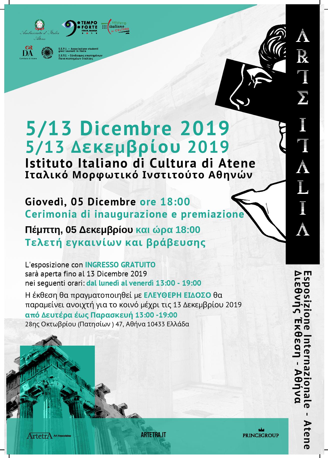 Programma – La Cerimonia di inaugurazione della mostra “L’Italianità” è prevista per il 5 dicembre 2019 alle ore 18,00. In apertura della mostra si terrà il concerto del Maestro Andrea Pontarelli che si esibirà nella “Après une Lecture de Dante”, una sonata di Franz Liszt del 1849, ispirata alla Divina Commedia di Dante Alighieri. Alle ore 18,30 sarà presentata l’esposizione internazionale di Atene “Arte Italia 2019”. Interverranno il Presidente di Giuria Alessandro Masi, segretario generale della “Società Dante Alighieri”; l’ambasciatore Efisio Luigi Marras; Anna Mondavio, direttrice dell’Istituto Italiano di Cultura di Atene; Giuseppe De Luca, presidente della Società Dante Alighieri – Comitato di Atene; Marco Galdi, docente universitario e presidente della “Società Filellenica Italiana”; Veronica Nicoli, curatore d’arte e presidente dell’associazione culturale ArtetrA. Alle ore 19 si terrà la cerimonia di premiazione, a cui farà da corollario la musica eseguita da Max Baldino, che proporrà alcuni dei brani tratti dal suo ultimo album “Album – the most beautiful italian melodies”, pubblicato dalla Prince Editor.