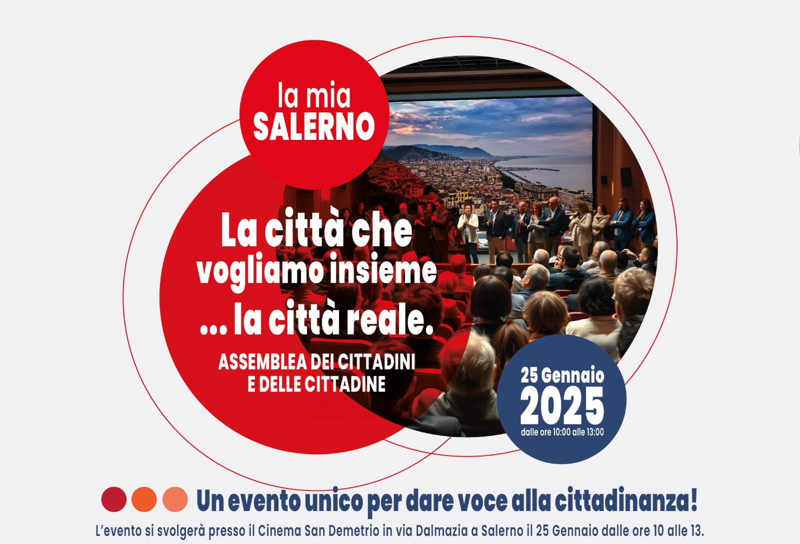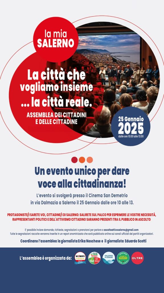 “Assemblea Pubblica: la Cittadinanza Protagonista!” è un evento che nasce dalla volontà di promuovere un dialogo diretto tra la politica e la comunità, offrendo uno spazio di ascolto alle esigenze quotidiane dei salernitani. L’obiettivo è creare una connessione reale e costruttiva tra chi vive la città ogni giorno e chi è chiamato a rappresentarla e governarla.