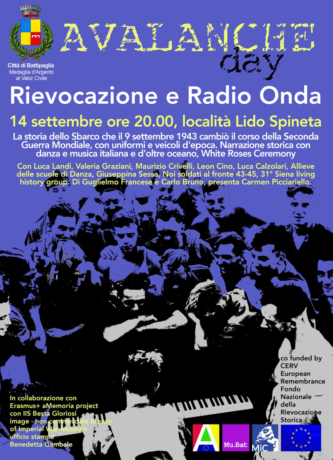 La manifestazione, inserita nel Progetto Internazionale Avalanche promosso nel quadro del programma European Remembrance della Direzione Generale UE – Giustizia e rientrante nella collaborazione con Erasmus+ aMemoria con l’Istituto Besta Gloriosi di Battipaglia, è organizzata dall’Associazione Mu.Bat con la collaborazione di Noi soldati al Fronte ‘43-’45 e con la partecipazione di 31º Siena Living History Group. Mira a celebrare non solo la storia, ma anche il valore della pace e della memoria condivisa attraverso l’arte.