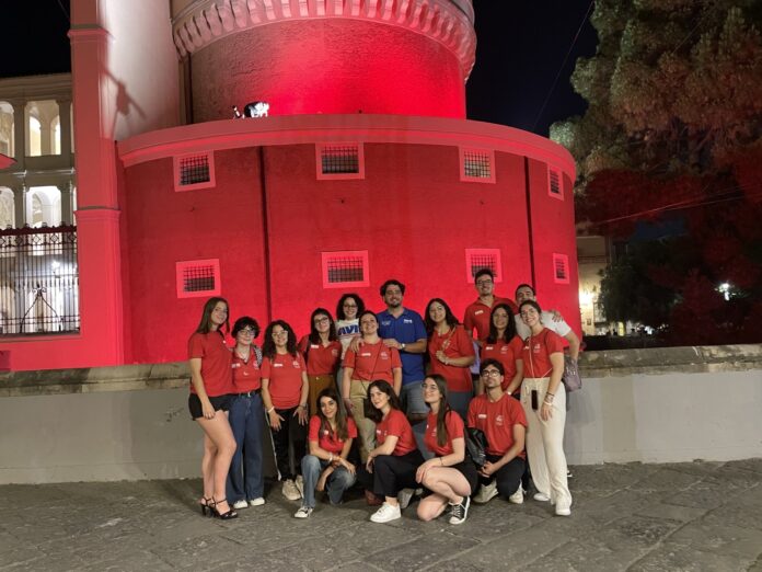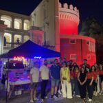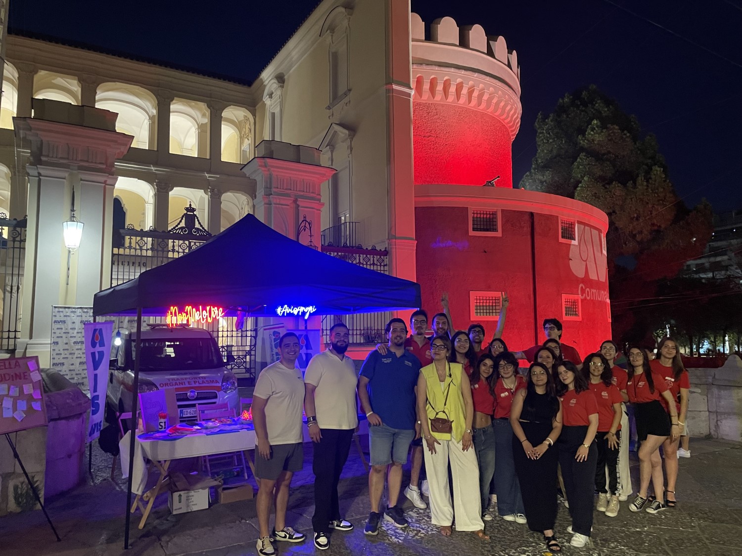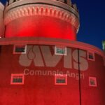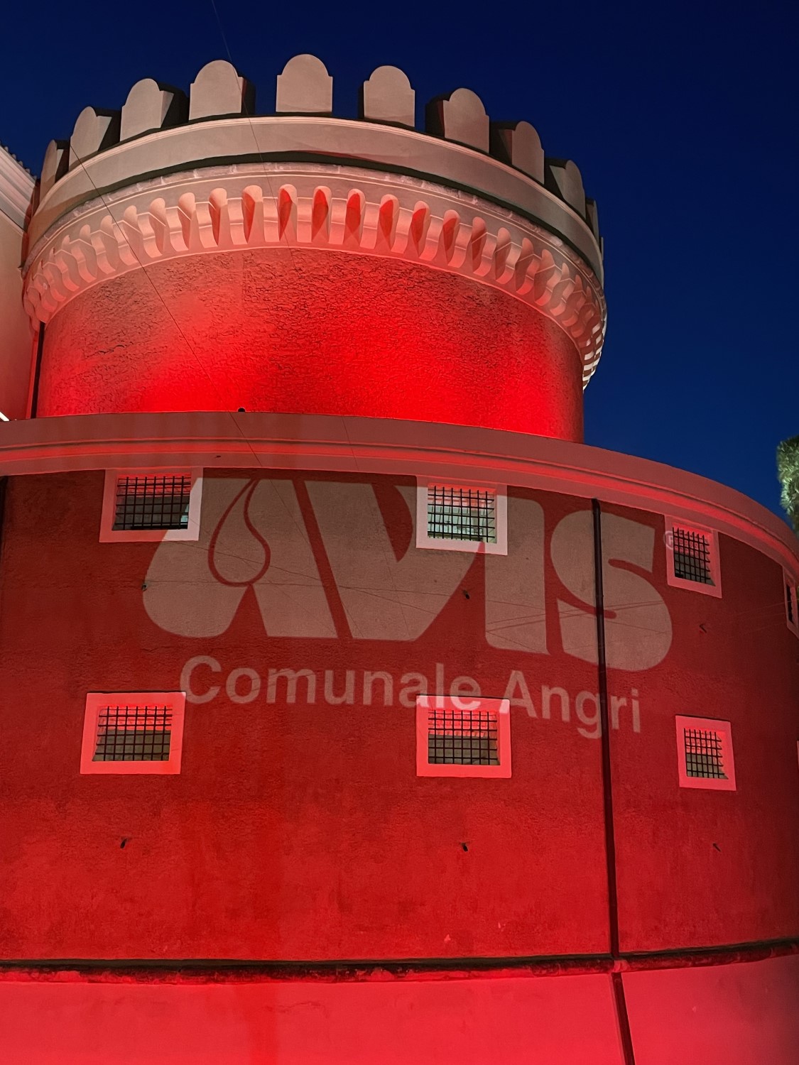 Illuminazione del Castello Doria al calar del sole: l’edificio storico è stato illuminato di rosso, con il logo dell’AVIS Comunale di Angri OdV al centro. L’installazione luminosa ha conferito un forte impatto simbolico, enfatizzando il legame tra il gesto del donare e la comunità cittadina.