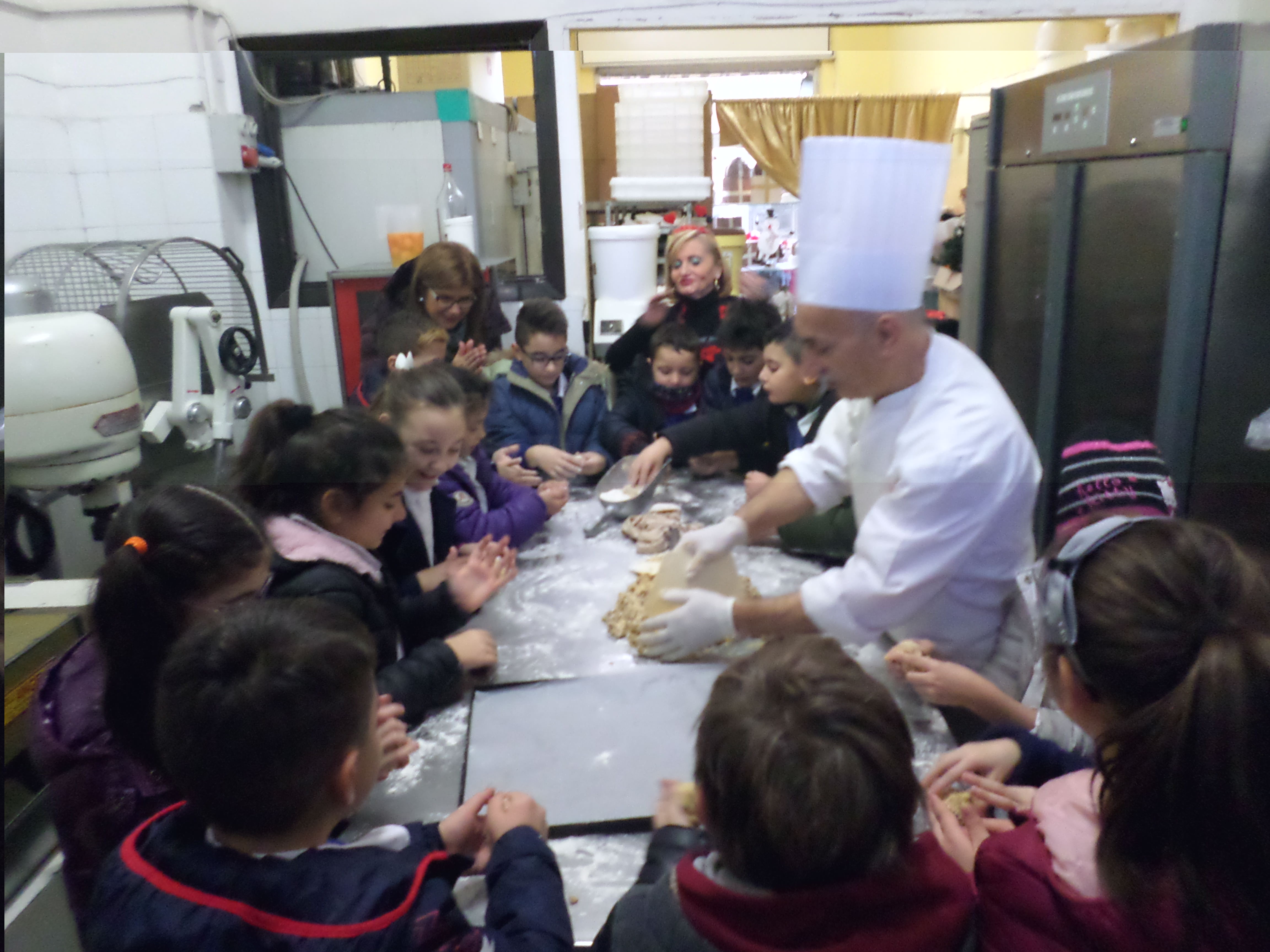 I bambini delle classi III A-B-C-D-E-F hanno così potuto osservare da vicino le fasi della preparazione dei dolci da parte del Maestro Pasticciere Carmine Faiella, ed hanno fattno nmerose domande al maestro, con curiosità ed interesse, ed hanno potuto assaggiare le delizie create apposta per loro.