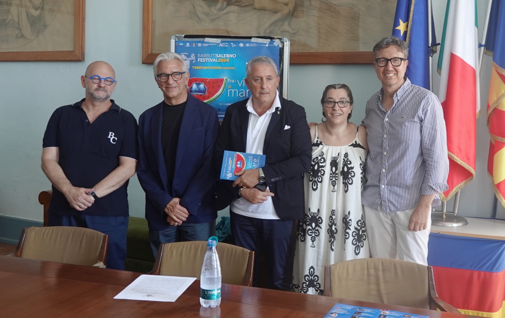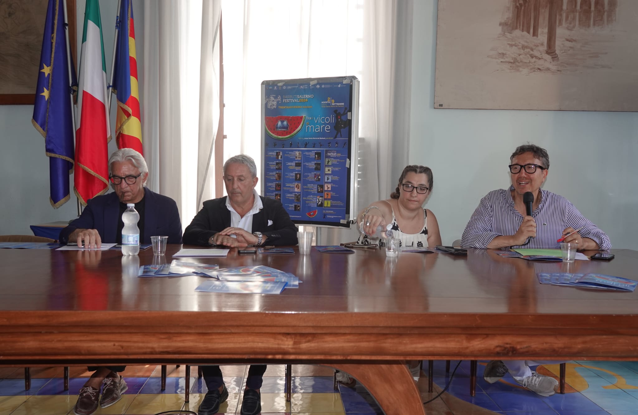 Presentata, presso il Salone dei Marmi del Comune di Salerno, la XXXIX edizione della rassegna estiva di teatro “Barbuti Festival”. Alla presenza, tra gli altri, de: il sindaco di Salerno, Vincenzo Napoli, l’assessore al Turismo e alle Attività Produttive, Alessandro Ferrara, l’assessore al Commercio e all’Urbanistica, Dario Loffredo, la direttrice organizzativa della rassegna Chiara Natella, della Bottega San Lazzaro, e i curatori delle specifiche iniziative incluse nel più ampio cartellone del Festival, ovvero Brunella Caputo (La Notte dei Barbuti), Andrea Carraro (Foglie di Teatro), Eduardo Scotti (Salerno Day) e Antonella Iannone (Danza sotto le stelle) è stato illustrato il cartellone di spettacoli che da oltre sette lustri va in scena sul palcoscenico sotto le stelle della piazza longobarda di S. Maria dei Barbuti, nel centro storico di Salerno.