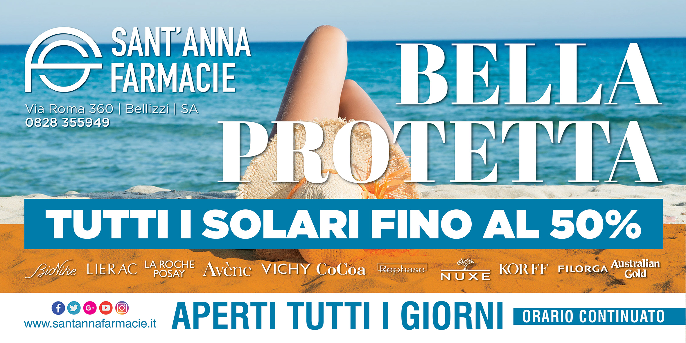 Prenderà il via domani 1° giugno “Bella Protetta”, la nuova campagna estiva di prevenzione di Sant’Anna Farmacie. Come ogni anno, con l’arrivo dell’estate le nostre farmacie diventano il luogo dove informarsi e scoprire come proteggere il corpo dai rischi legati all’esposizione solare. Per l’intero periodo estivo, nelle sedi di Bellizzi e Baronissi, il nostro personale specializzato sarà in grado di fornire una consulenza personalizzata a ciascun cliente. In base alle esigenze di ognuno, i nostri esperti sapranno consigliare il prodotto giusto per proteggere pelle e capelli dal sole. Una consulenza in grado di garantire protezione, senza rinunciare alla piacevole sensazione di una pelle abbronzata e affascinante.