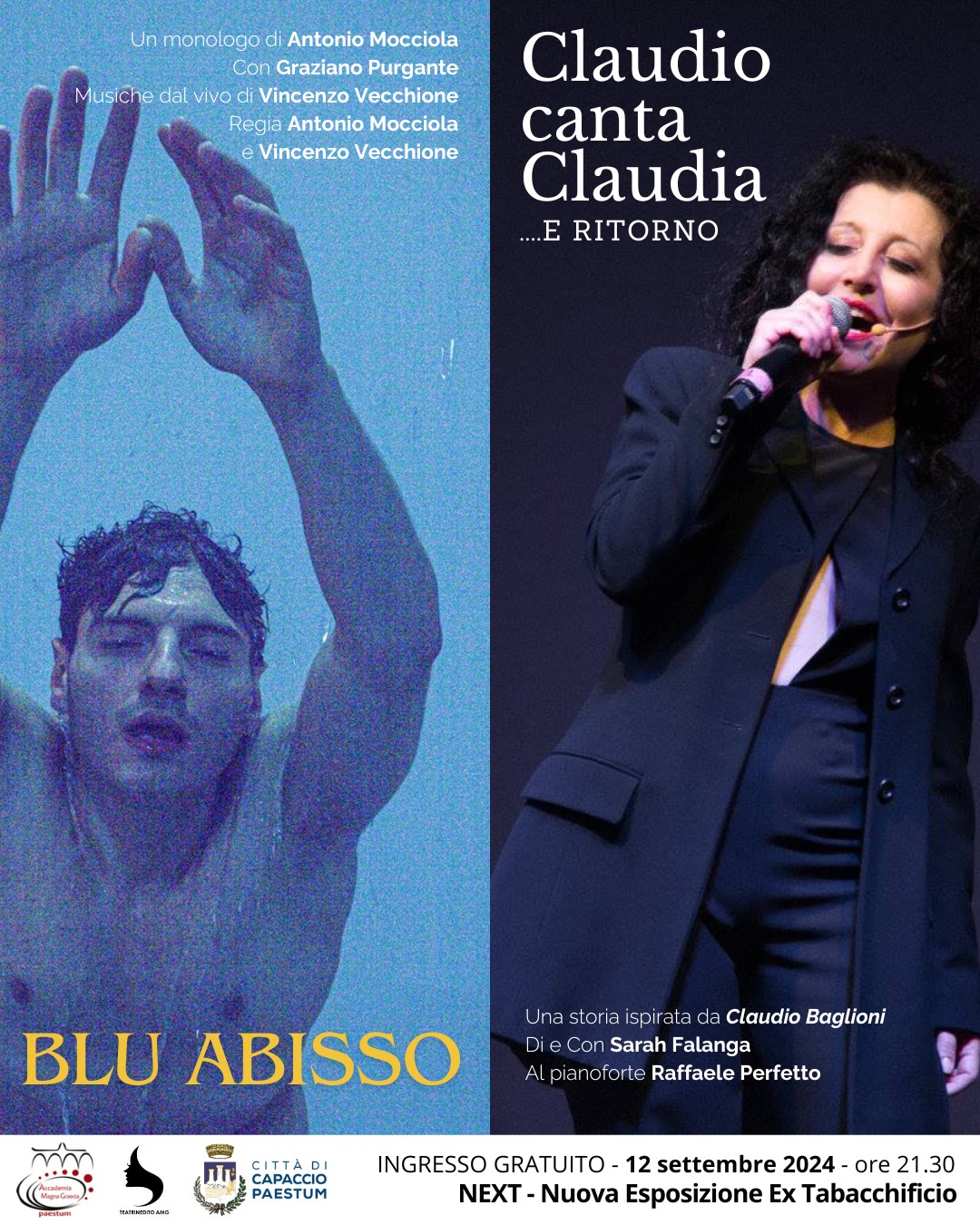 Dopo il monologo sul “Tuffatore”, la sera del 12 settembre, ci sarà anche “Claudio canta Claudia…e ritorno”, una “storia di Donna” che viene raccontata attraverso le canzoni di un autore “pittore” (poiché “dipinge”…) le atmosfere attraverso le parole delle sue canzoni: Claudio Baglioni.