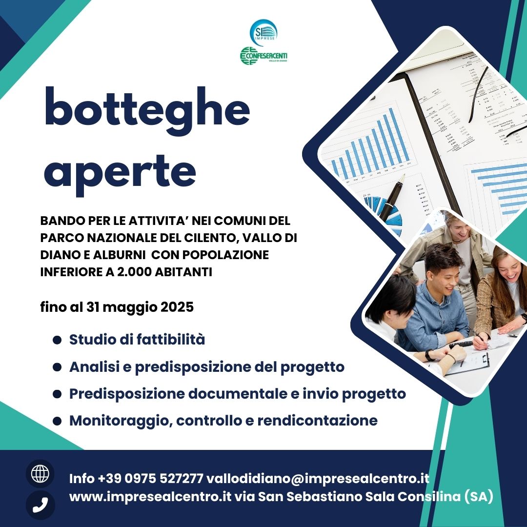 La Confesercenti Vallo di Diano, guidata dalla dottoressa Maria Antonietta Aquino, informa che l’Ente Parco Nazionale del Cilento, Vallo di Diano e Alburni, con l’Avviso “Botteghe aperte”, intende sostenere interventi di efficientamento energetico e adeguamento tecnologico delle attività nei piccoli comuni a rischio desertificazione.